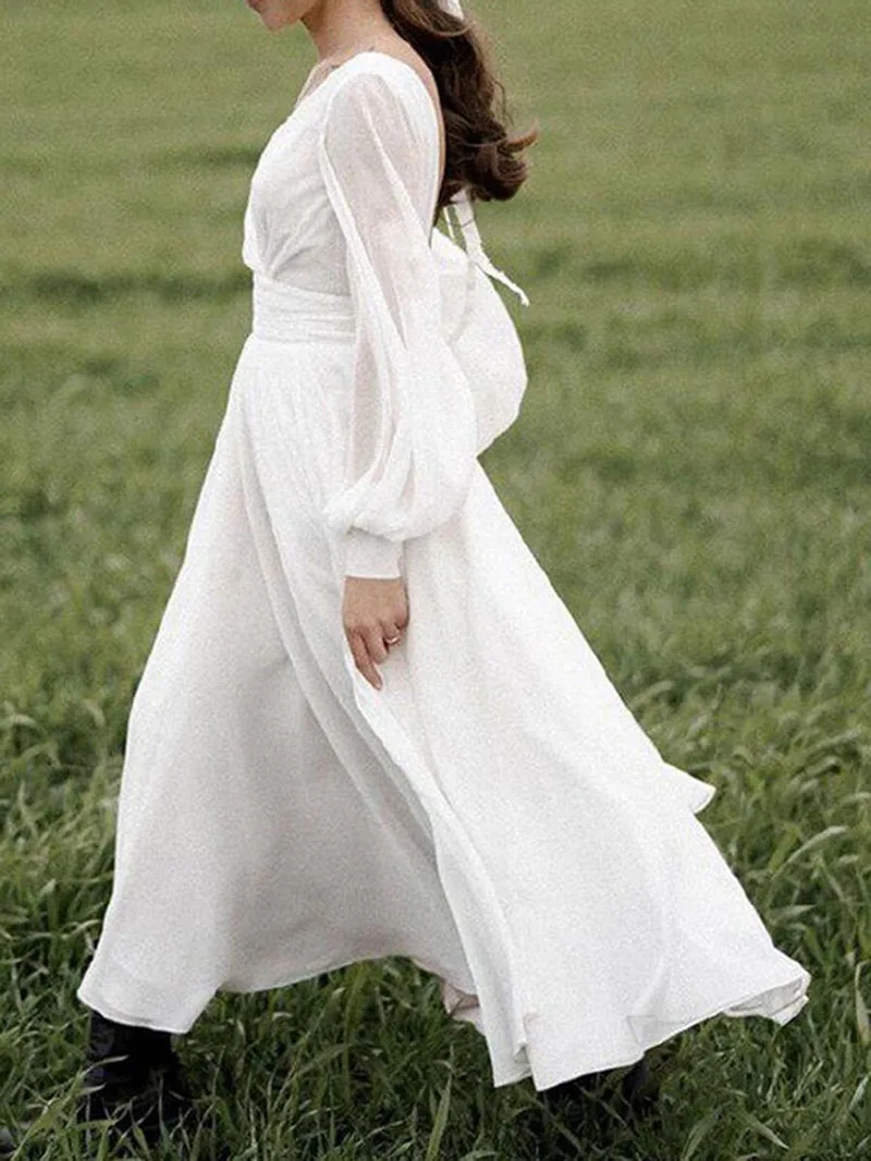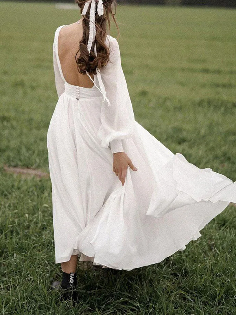 Fleepmart 2022 Summer Vintage Women Maxi Dress Long Sleeve Sexy Backless Vocation Tunic Long Beach Dress