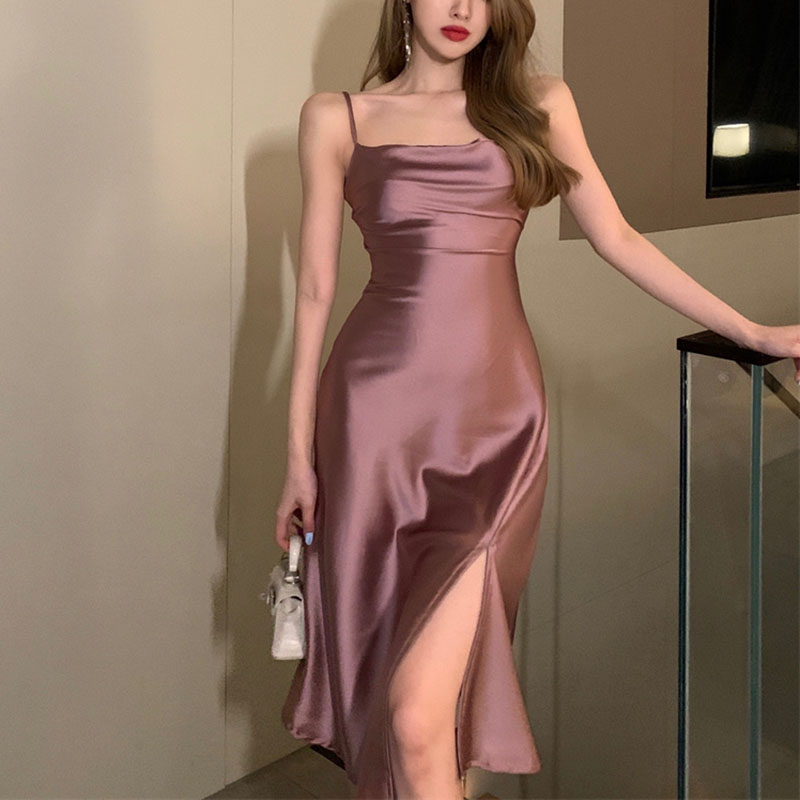 Fleepmart 2022 Summer Women Satin Slip Dress Spaghetti Strap Sleeveless Sexy Backless Silk Slit Party Midi Dress