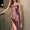 Fleepmart 2022 Summer Women Satin Slip Dress Spaghetti Strap Sleeveless Sexy Backless Silk Slit Party Midi Dress
