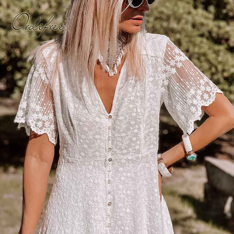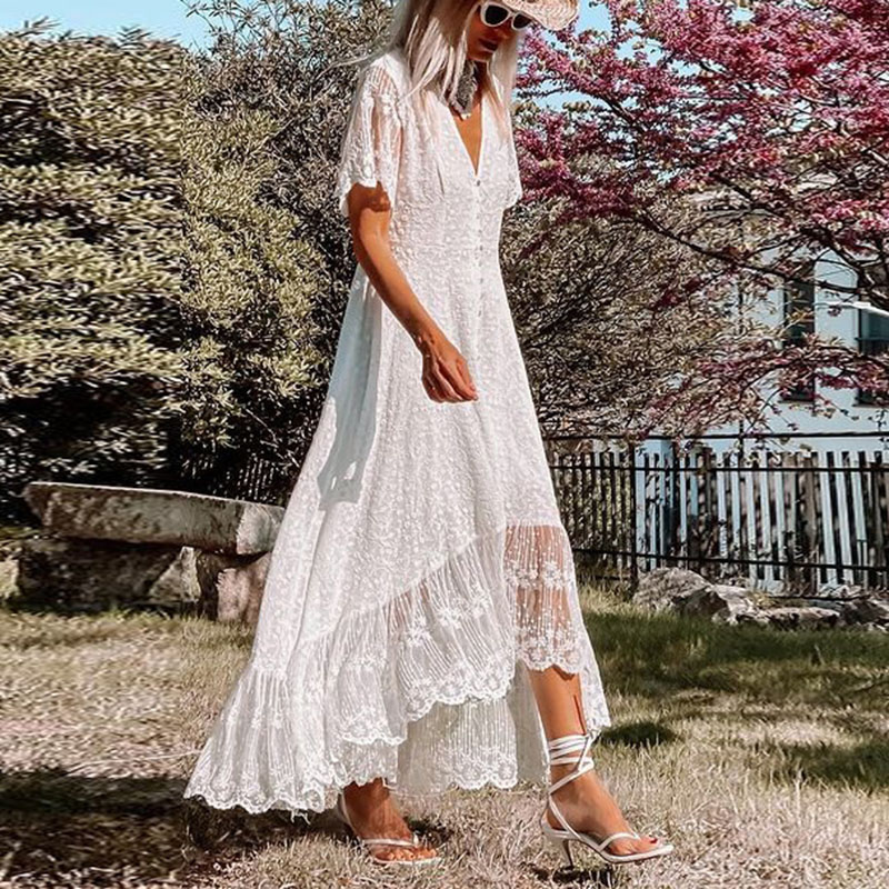Fleepmart 2022 Women Boho Maxi Dress Floral Embroidery Single Breasted Summer Vocation White Lace Sexy Tunic Long Beach Dress