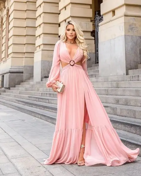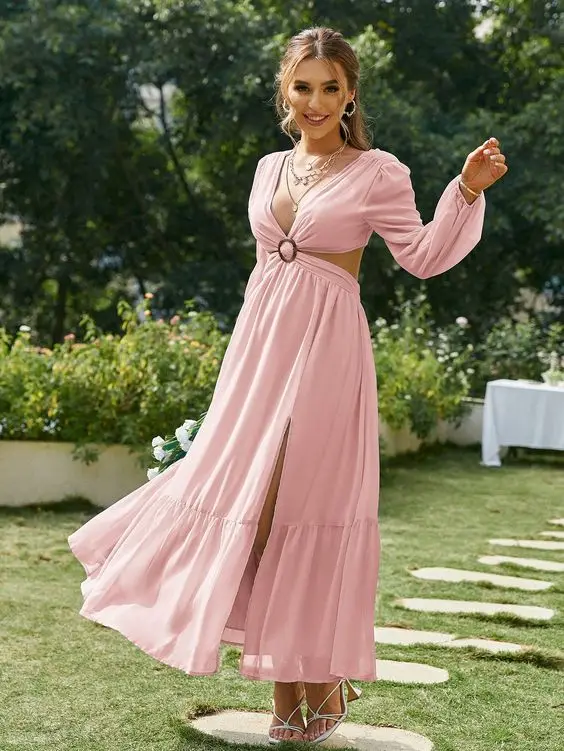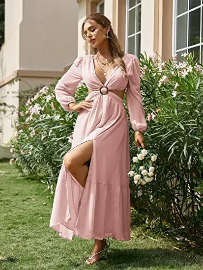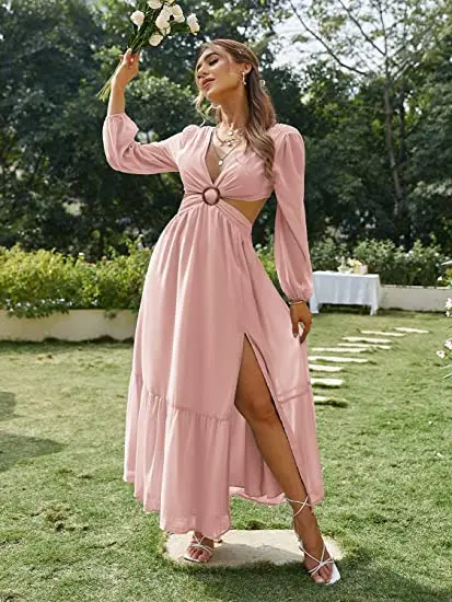 Fleepmart 2023 Elegant Long Blue Hollow Out Vacation Dress Tunic Women Summer Clothes Sexy V Neck Cut Out Evening Party Maxi Dresses
