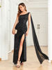 Fleepmart 2023 New Asymmetrical One Shoulder Sequin Evening Dress Sexy High Slit Bodycon Chiffon Ribbon Long Party Dress
