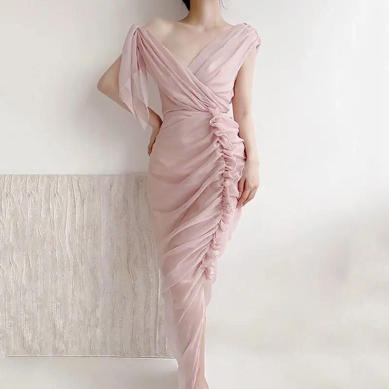 Fleepmart 2023 New Sweet Elegant Pink Mesh Voile V-Neck Irregular Pleated Dress Wedding Party Club Dress