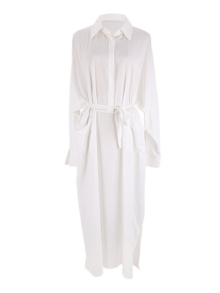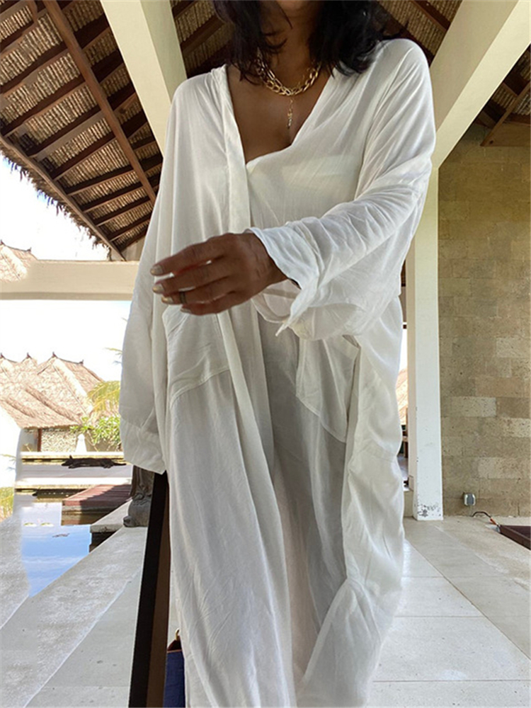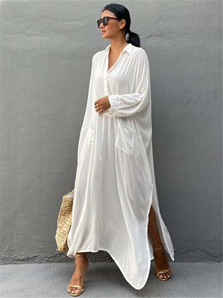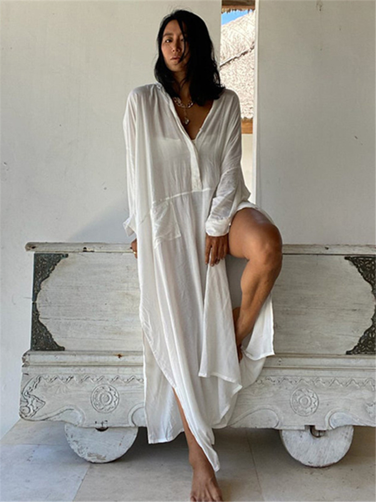 Fleepmart 2023 Sexy See-through Boho Loose Dresses Summer Turn-down Collar White V-neck Tunic Women Clothing Slit Beach Maxi Dress A2024