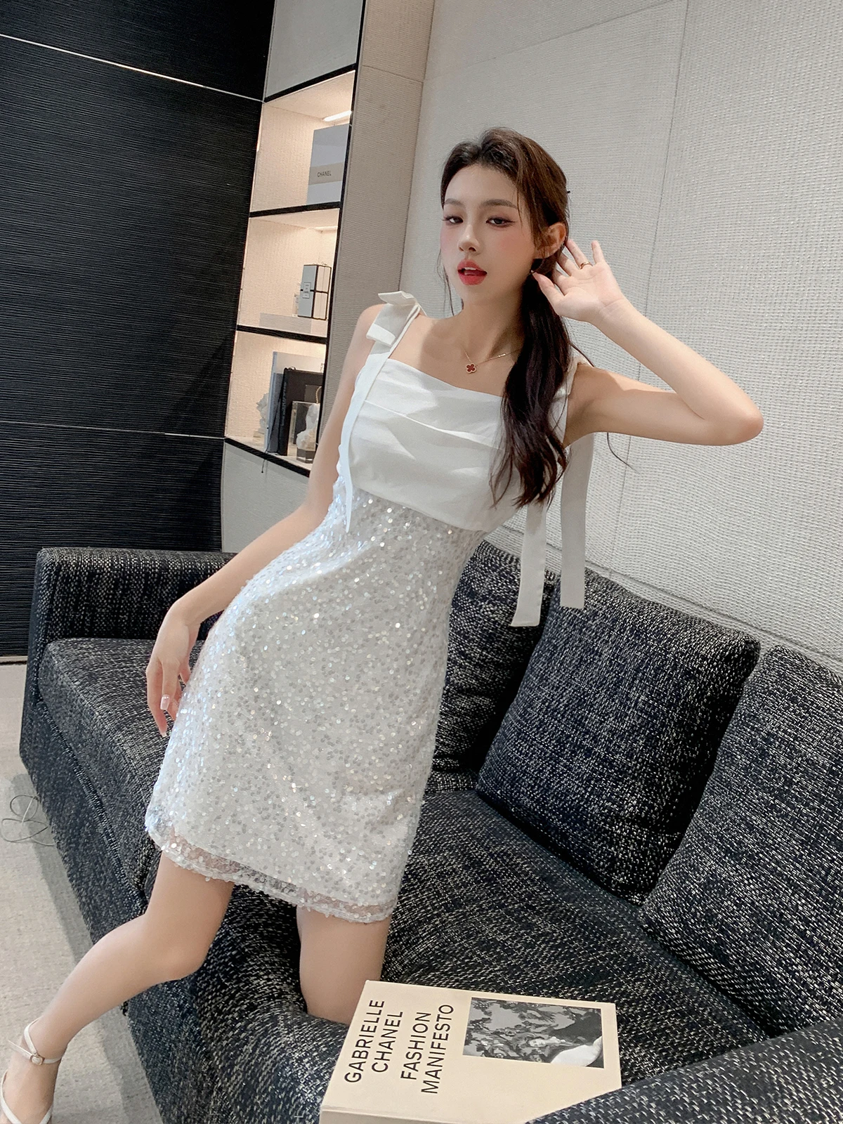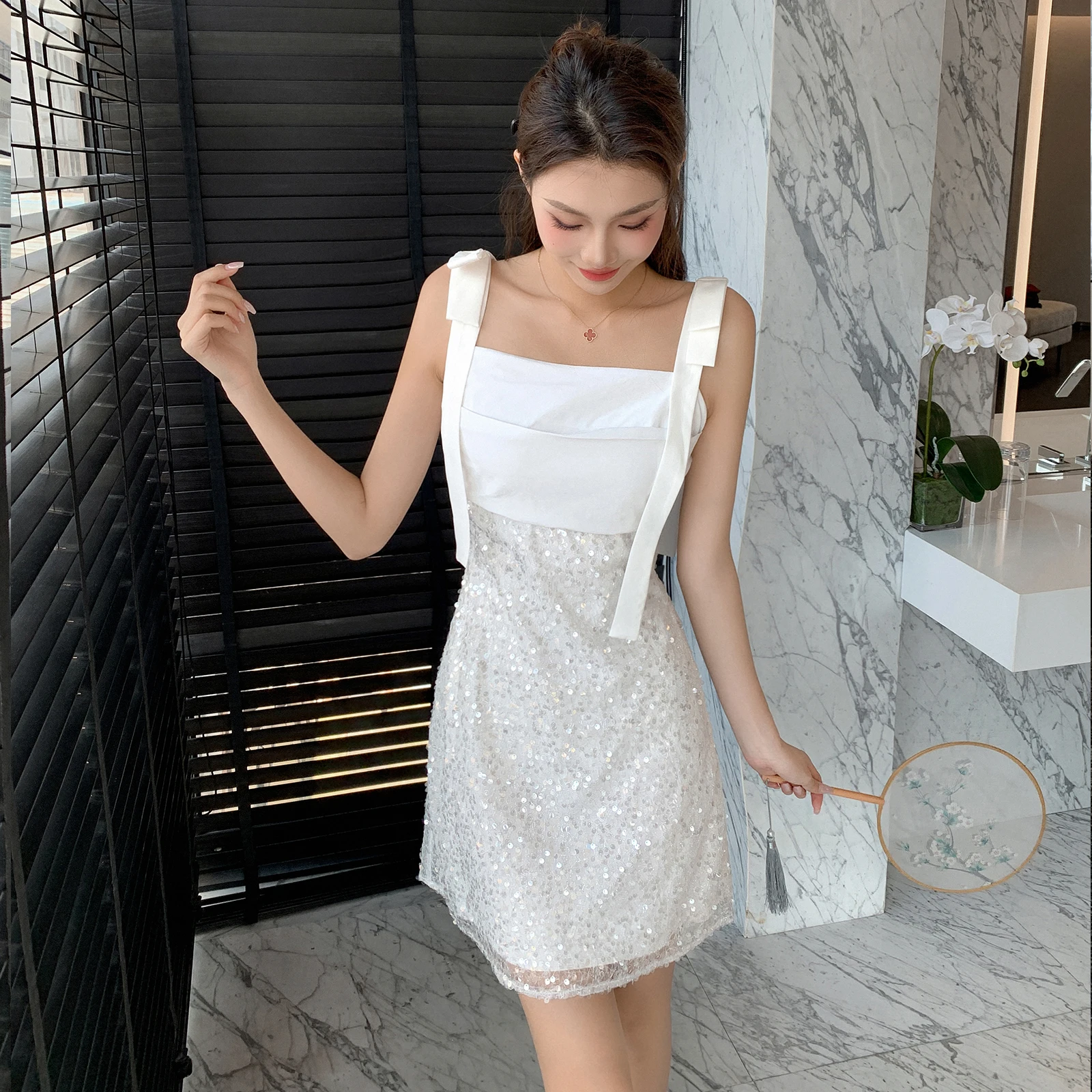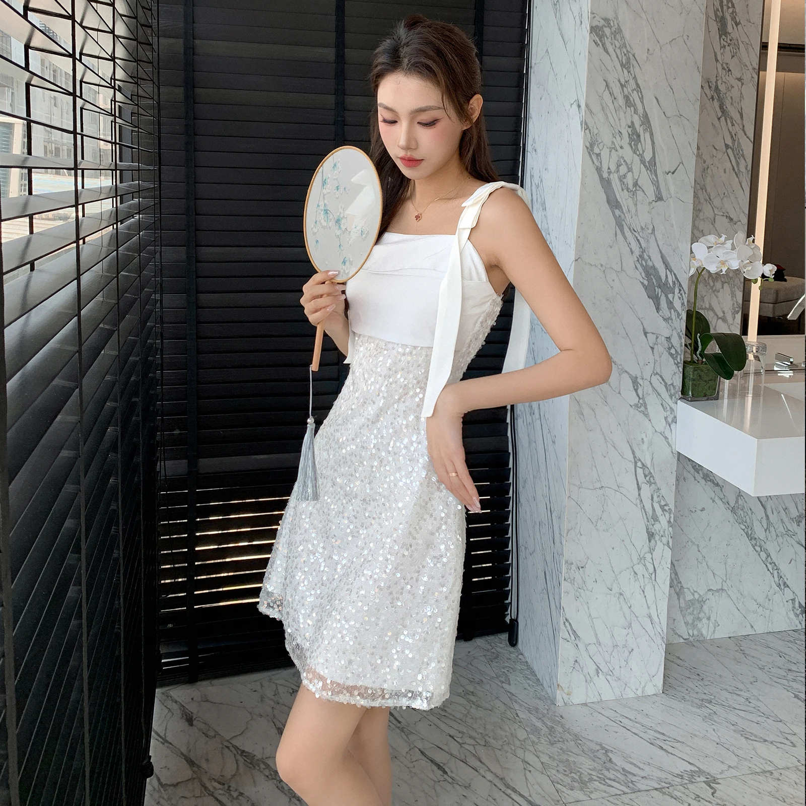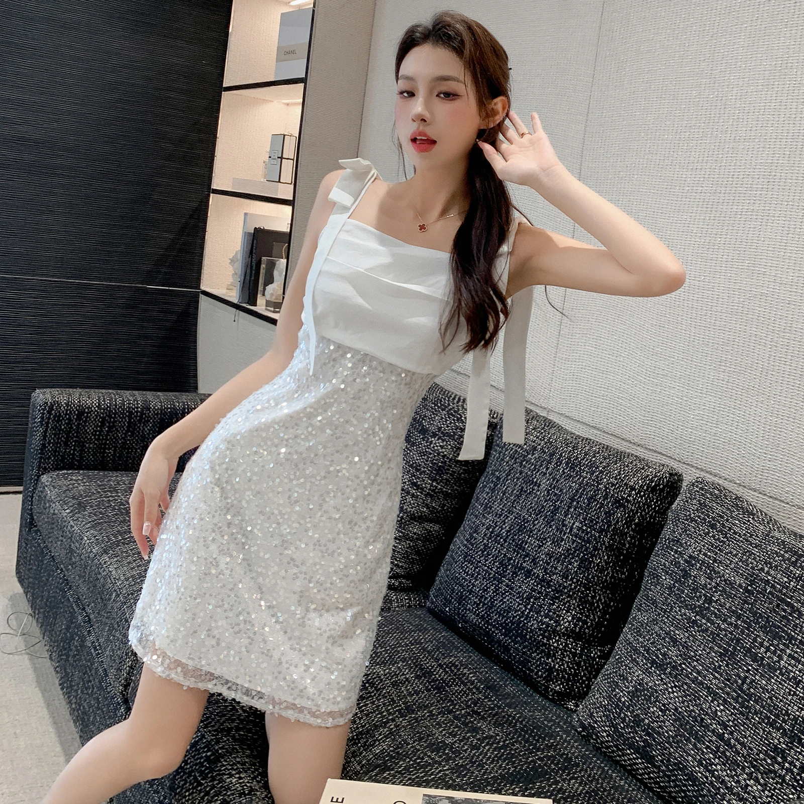 Fleepmart 2023 Summer Formal Dresses white patchwork sequin bow Spaghetti Strap Dress Fashion Elegant Slim Bodycon Party Dress