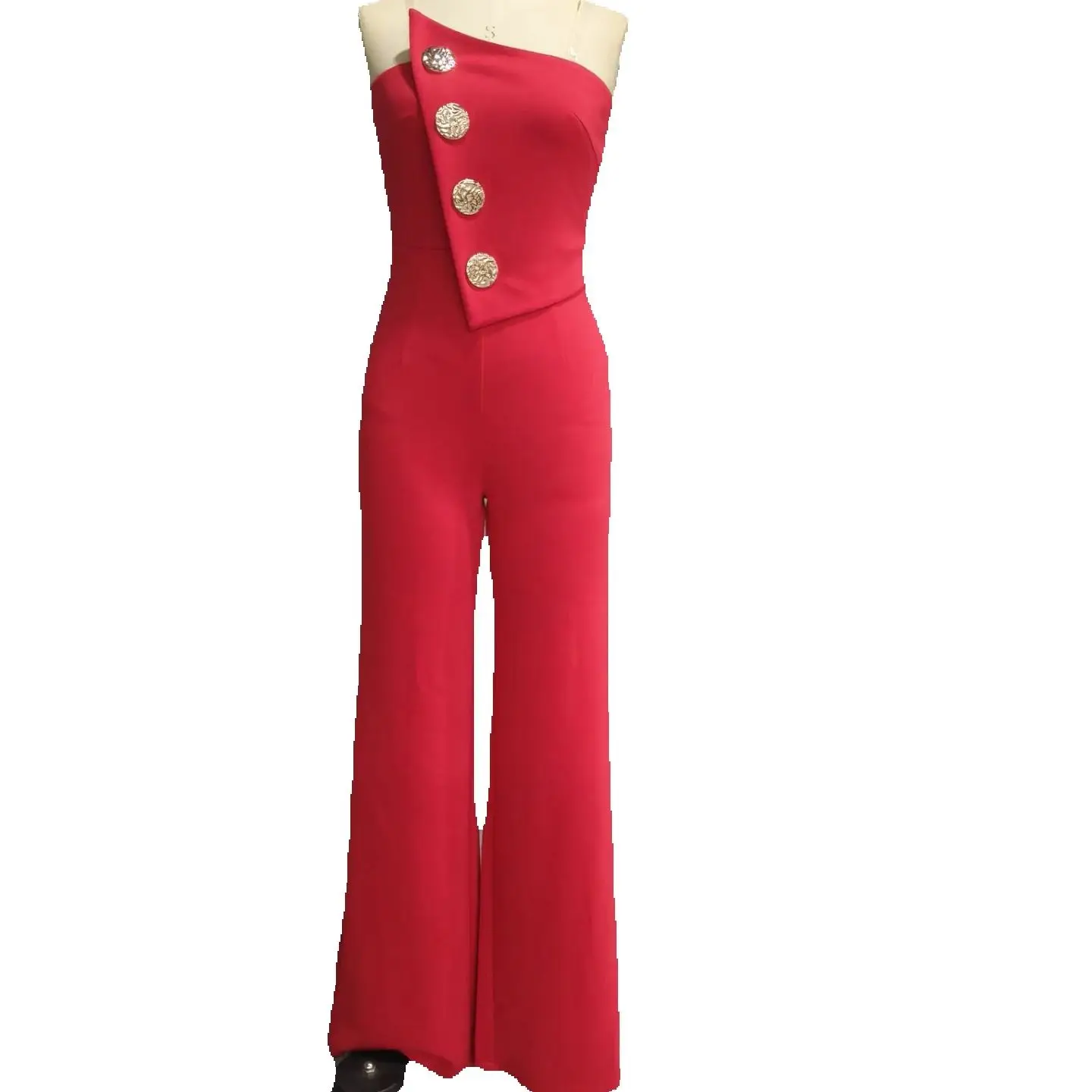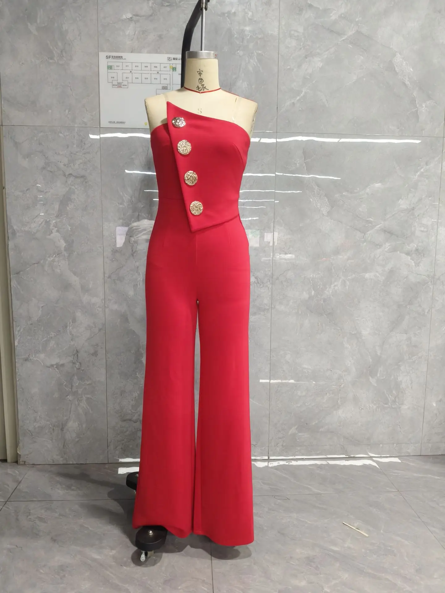 Fleepmart 2024 Asymmetrical Bandeau Strapless Jumpsuit Metal Button Decor Casual Overalls