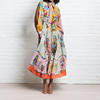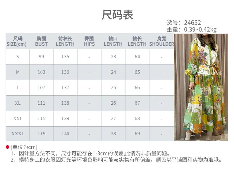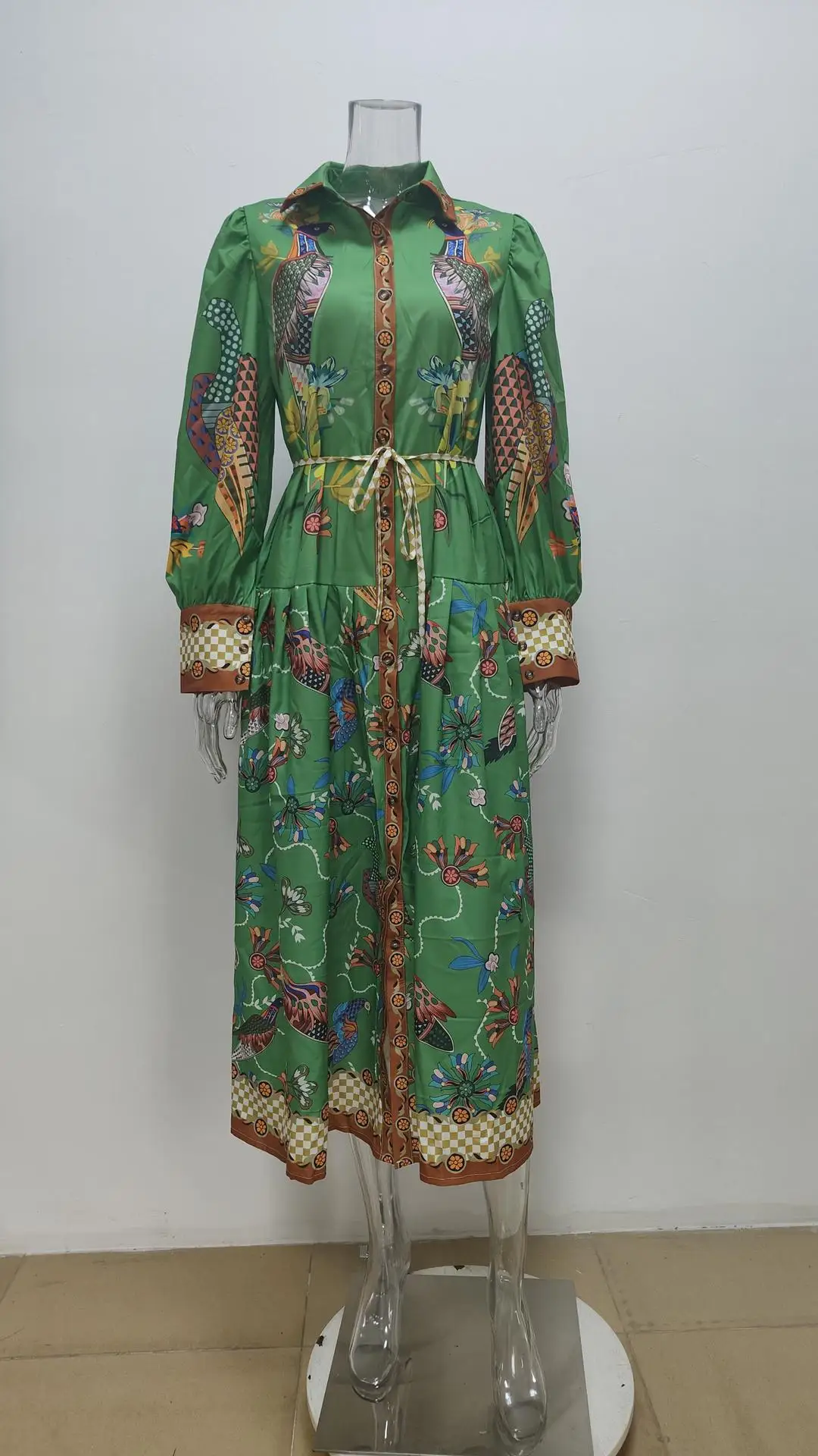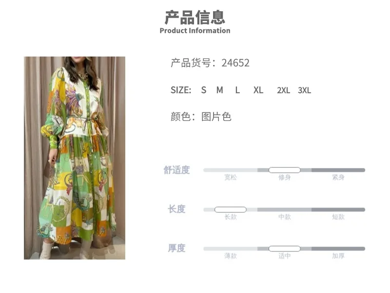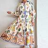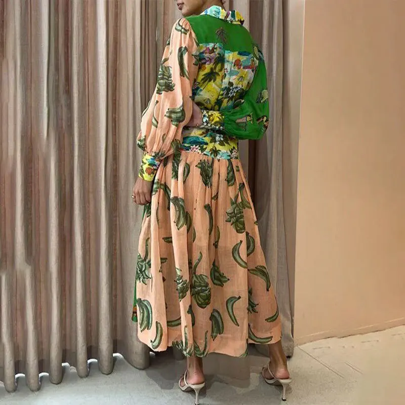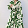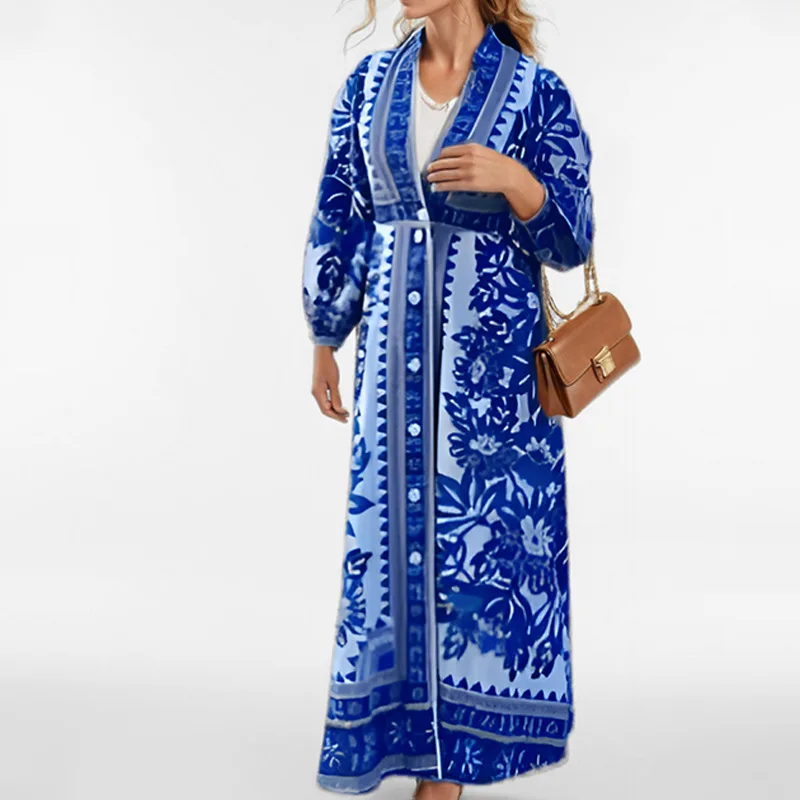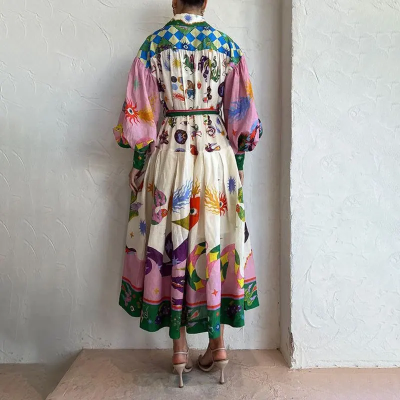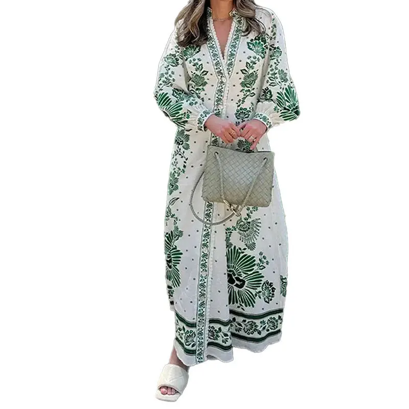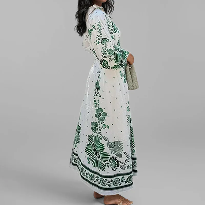 Fleepmart 2024 Autumn New Elegant and Fashionable Women’s Lantern Sleeve Printed Collar Large Swing Long Sleeve Dress