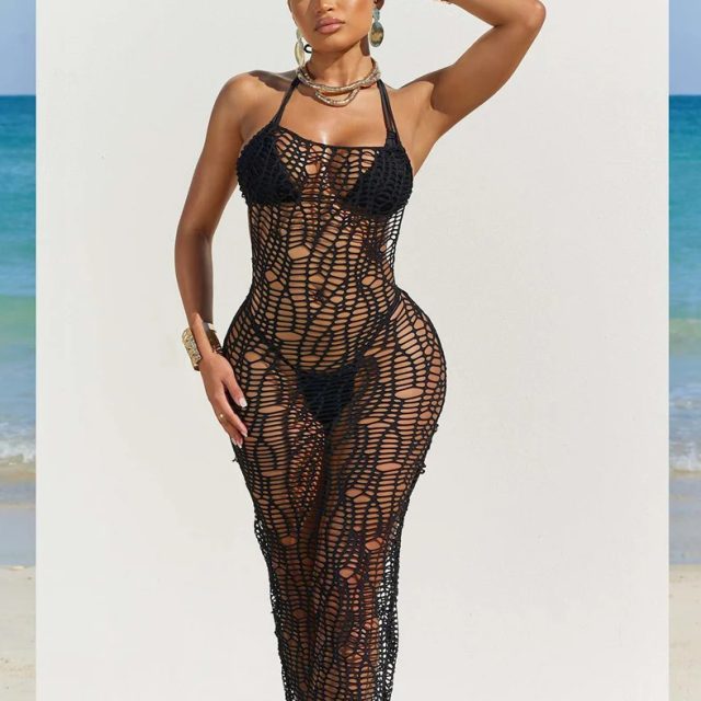 Fleepmart 2024 Cover-ups Knitted Sexy See Through Mesh Beach Cover Bikinis Hollow Out Summer Slim Bodycon Strappy Dress Tassel Sundress