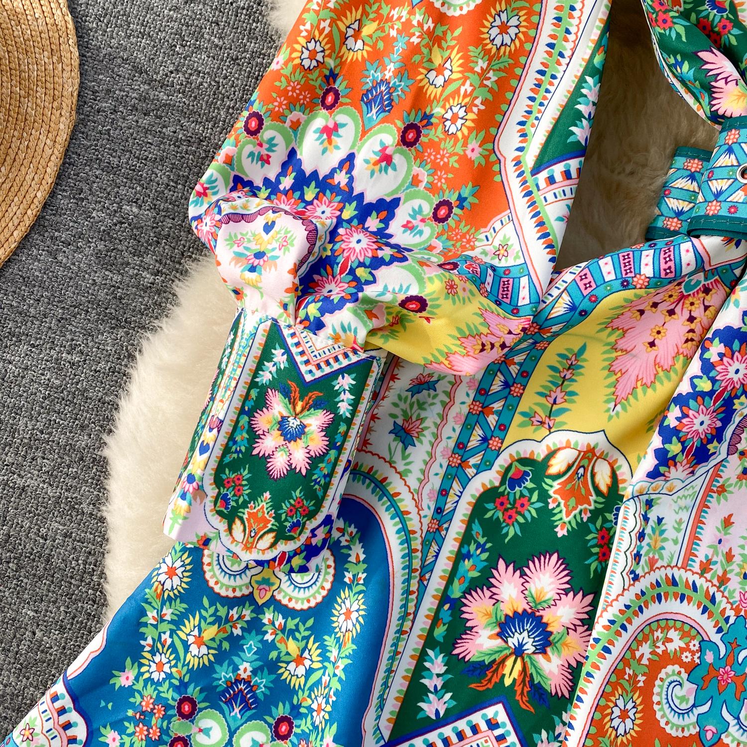 Fleepmart 2024 Fashion Paisley Flower Print Short Dress Women’s Stand Single Breasted Long Lantern Sleeve Belt Vintage Mini Vestidos