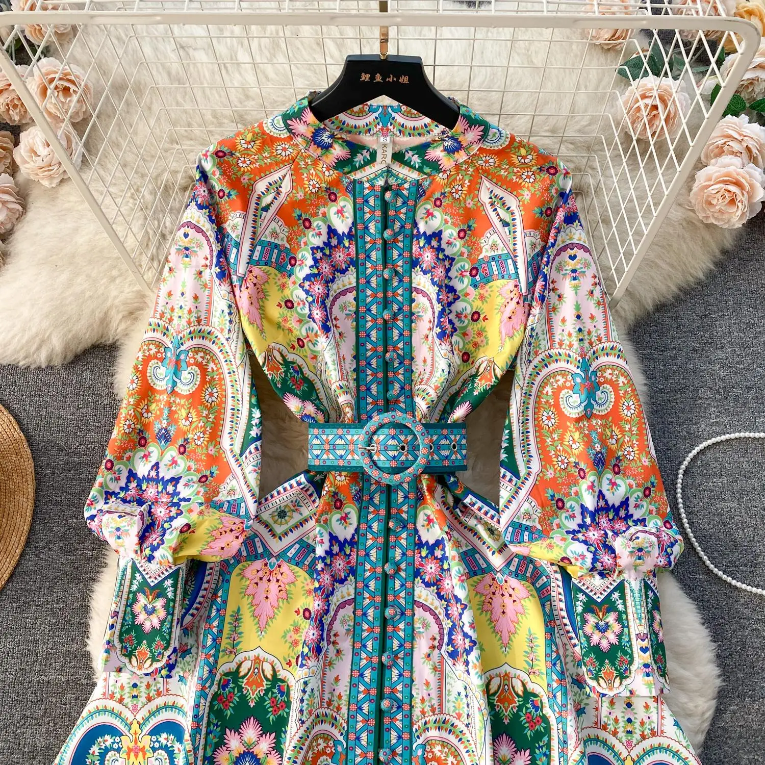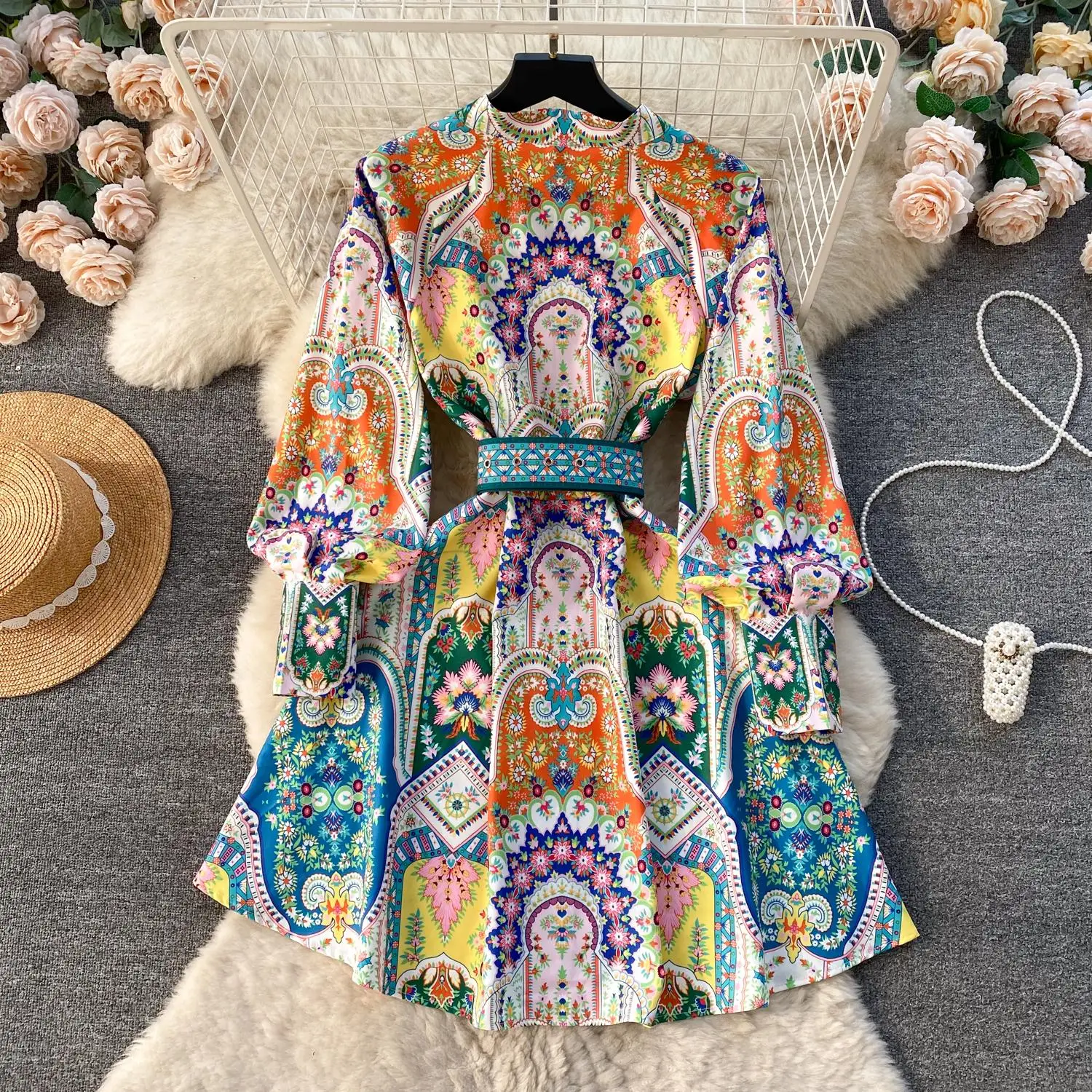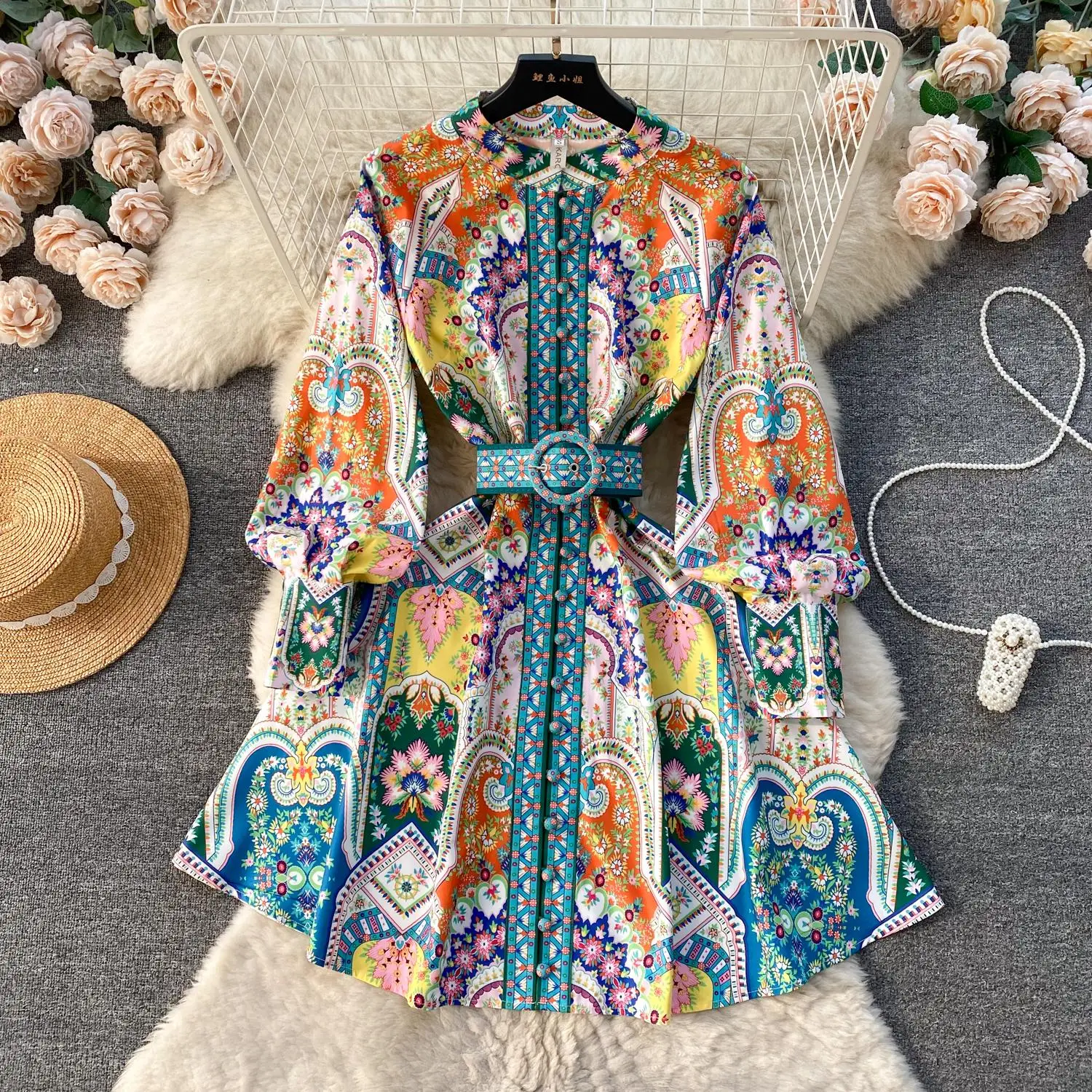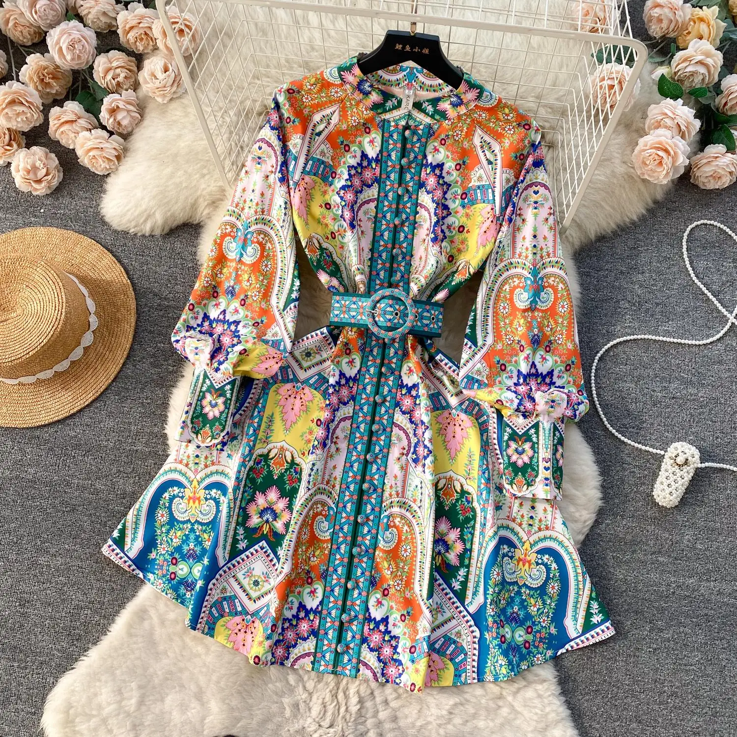 Fleepmart 2024 Fashion Paisley Flower Print Short Dress Women’s Stand Single Breasted Long Lantern Sleeve Belt Vintage Mini Vestidos