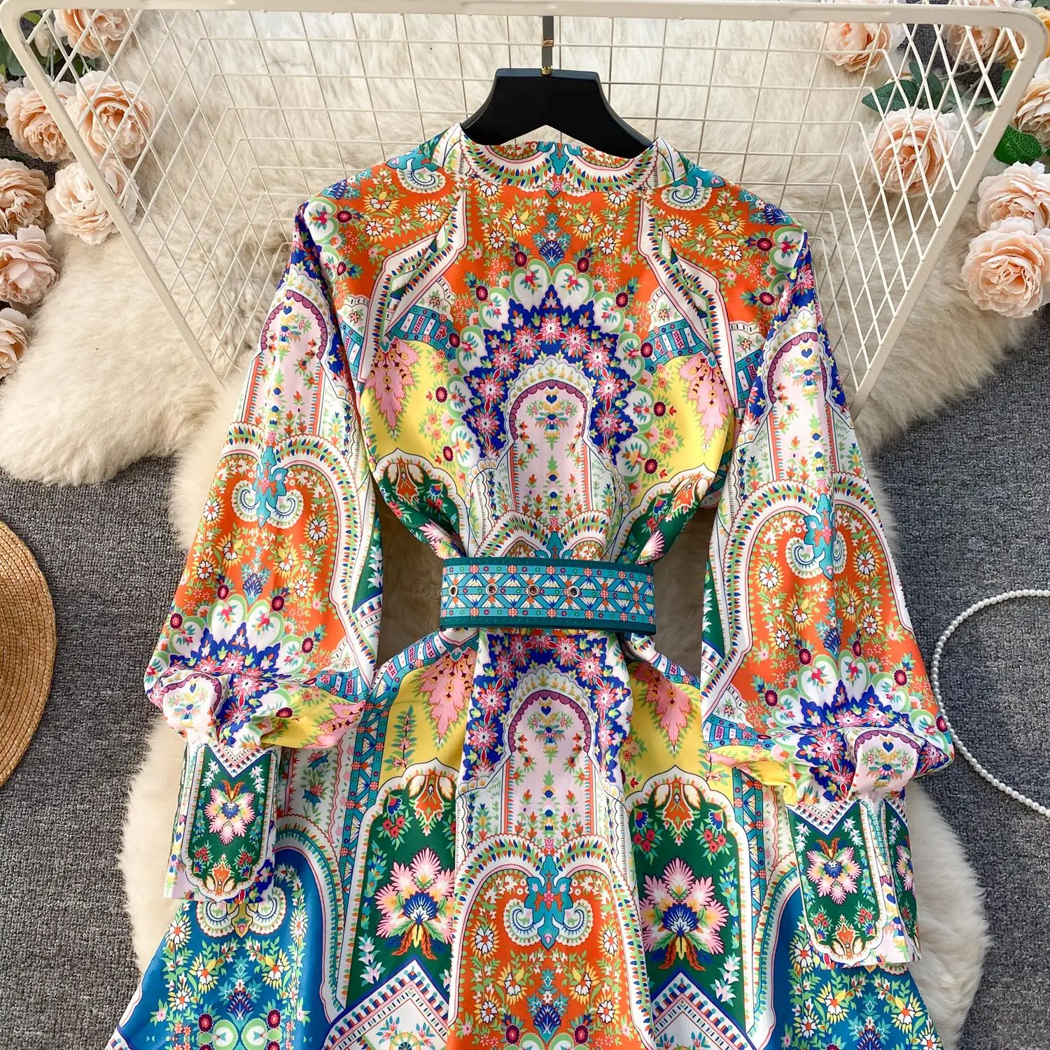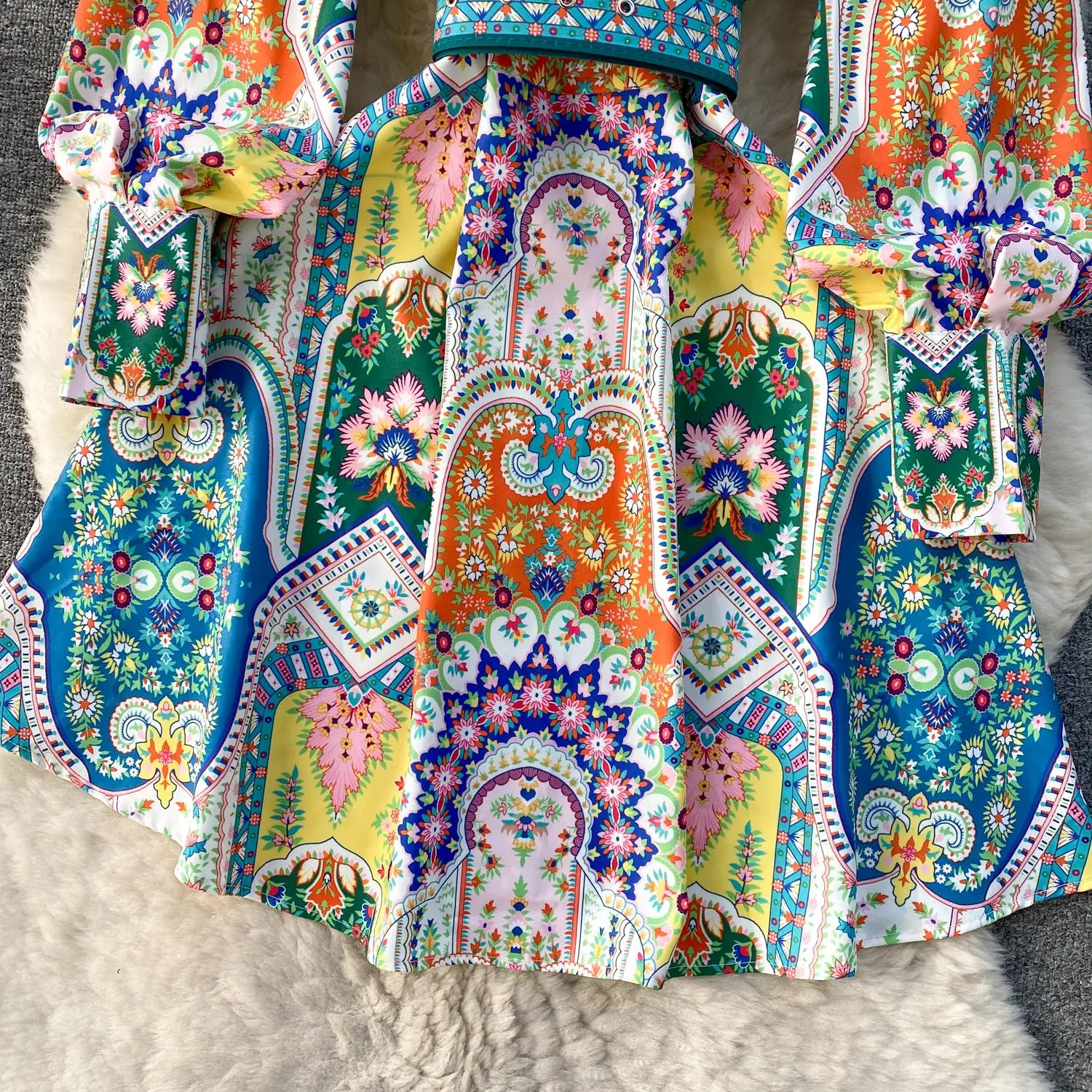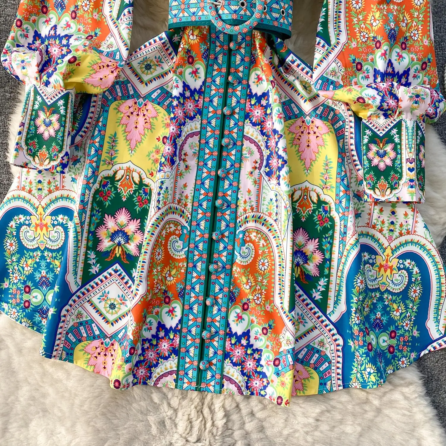 Fleepmart 2024 Fashion Paisley Flower Print Short Dress Women’s Stand Single Breasted Long Lantern Sleeve Belt Vintage Mini Vestidos