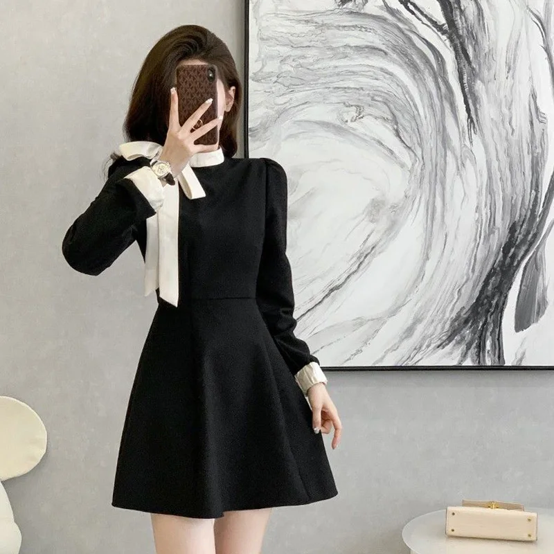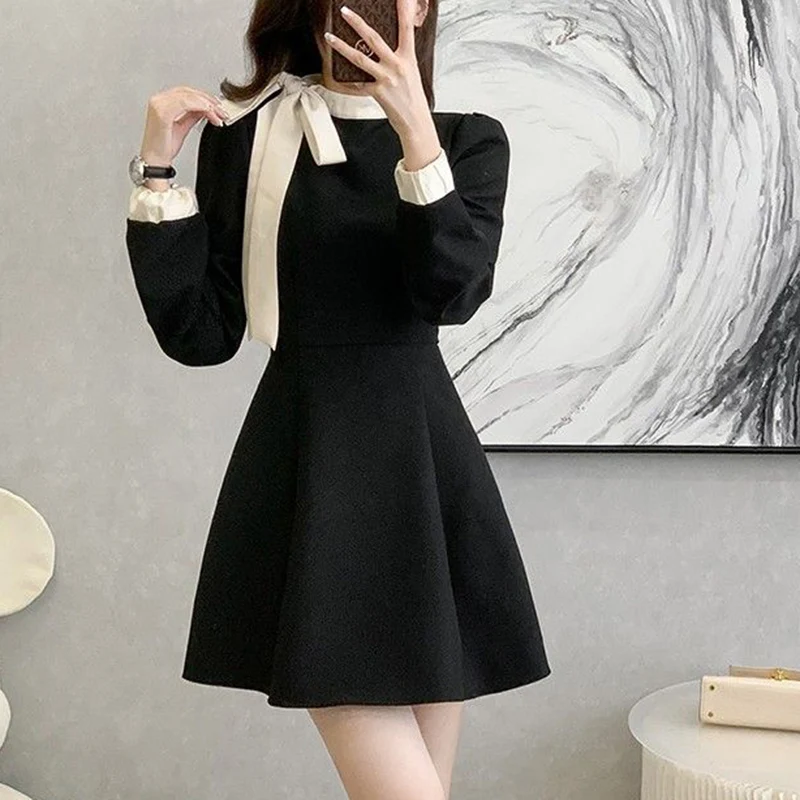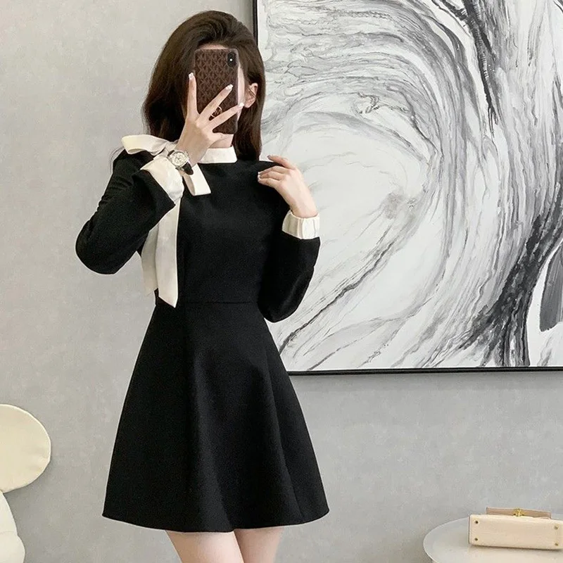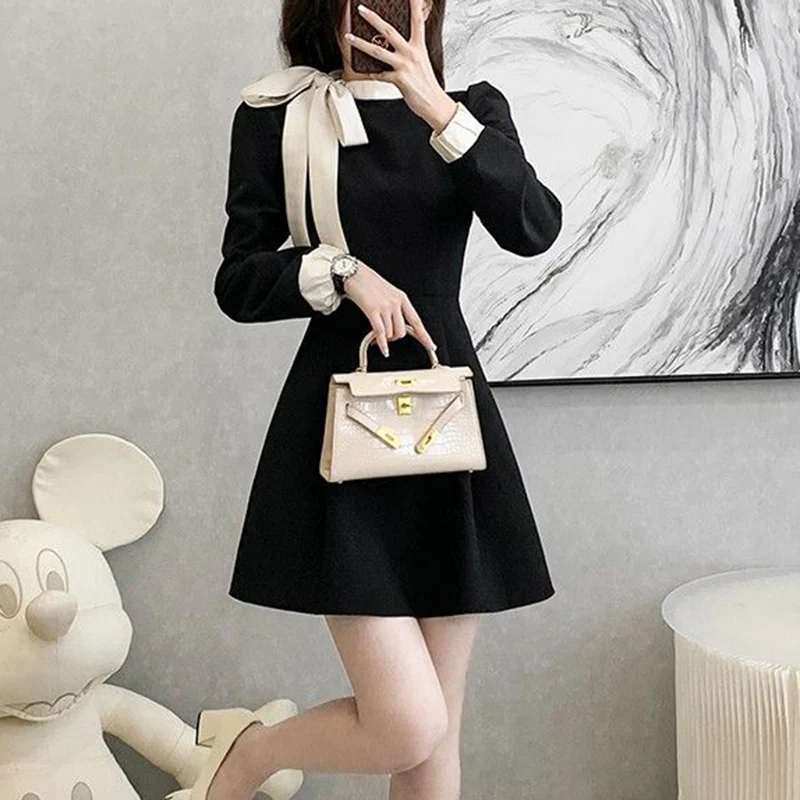 Fleepmart 2024 Hot Sale Women Chic Elegant Formal Occasion Mid-Length Dress Autumn Lady Korean Style Designer Bowknots Long Sleeves Dress