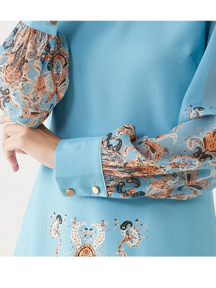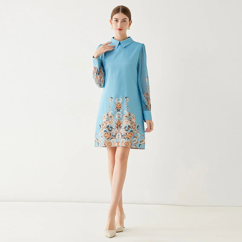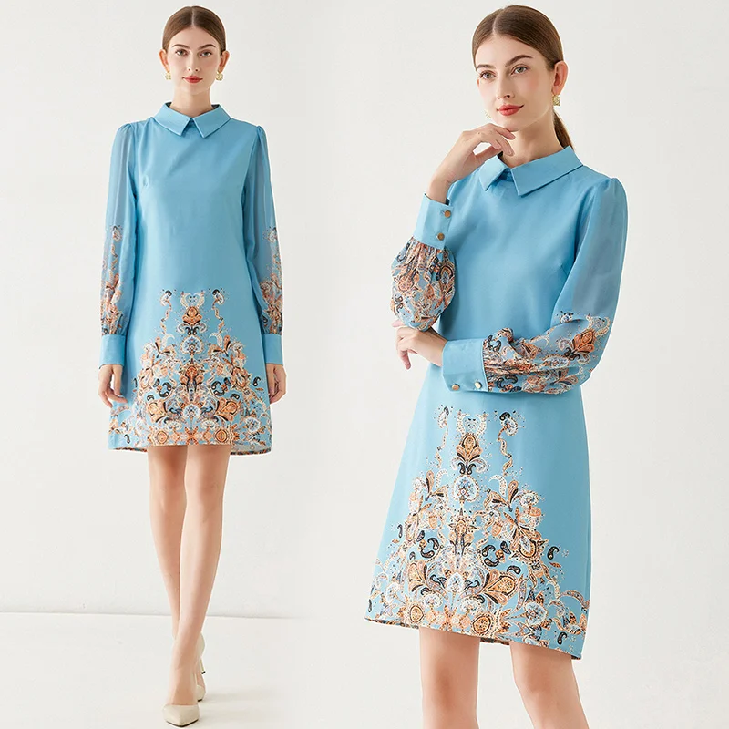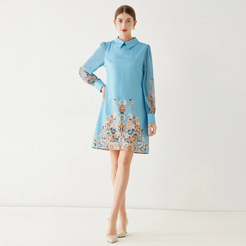 Fleepmart 2024 New Fashion Paisley Blue Mini Party Dress Women Long Sleeve Peter Pan Collar Floral Print A Line Vestidios