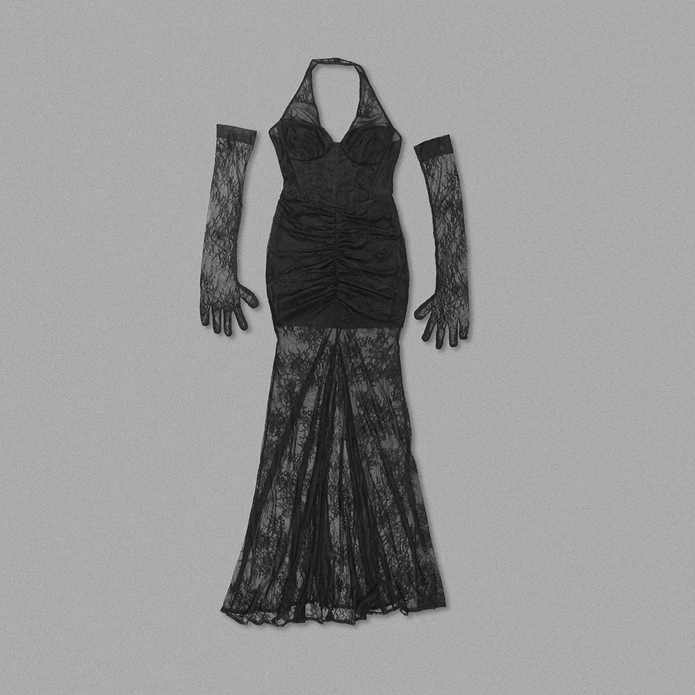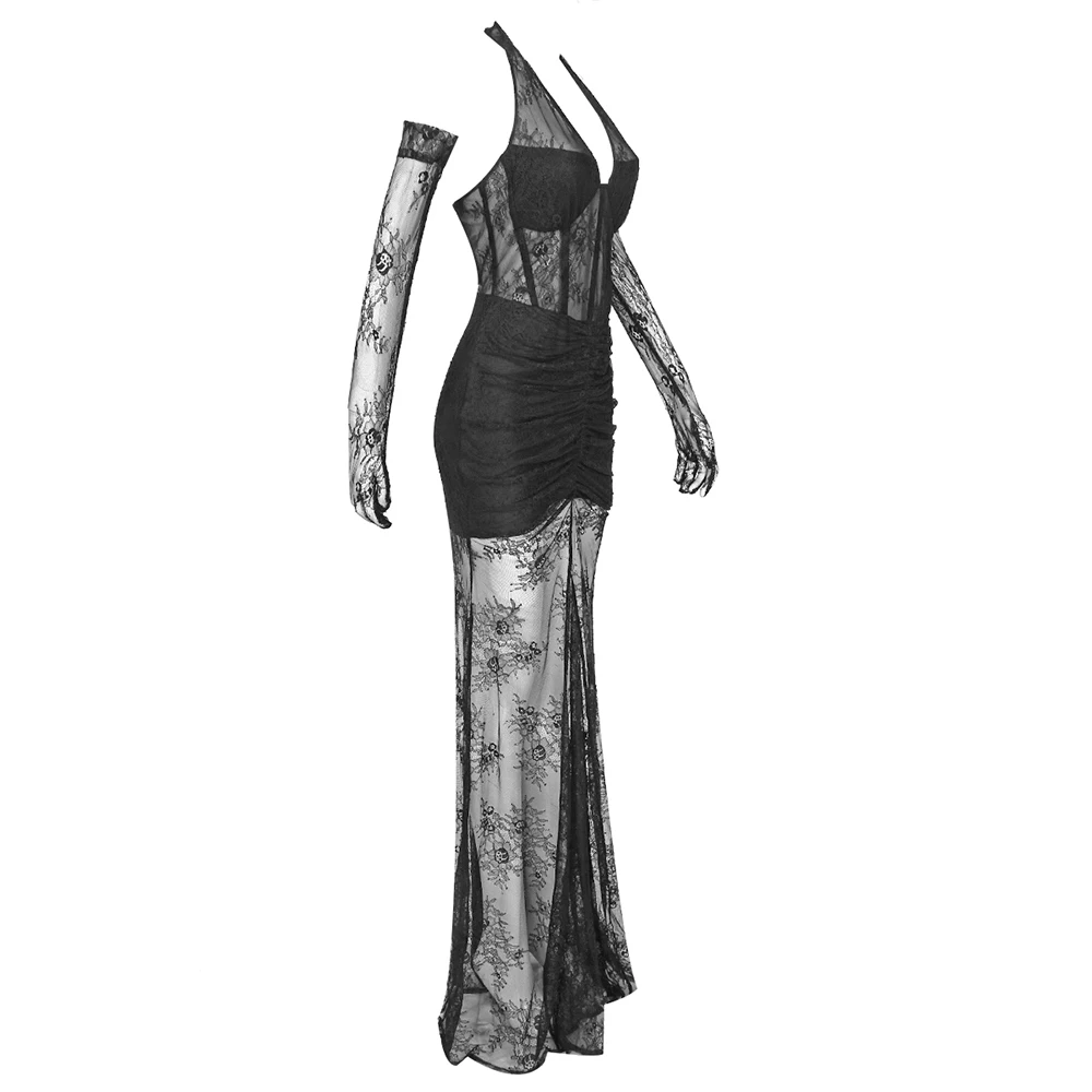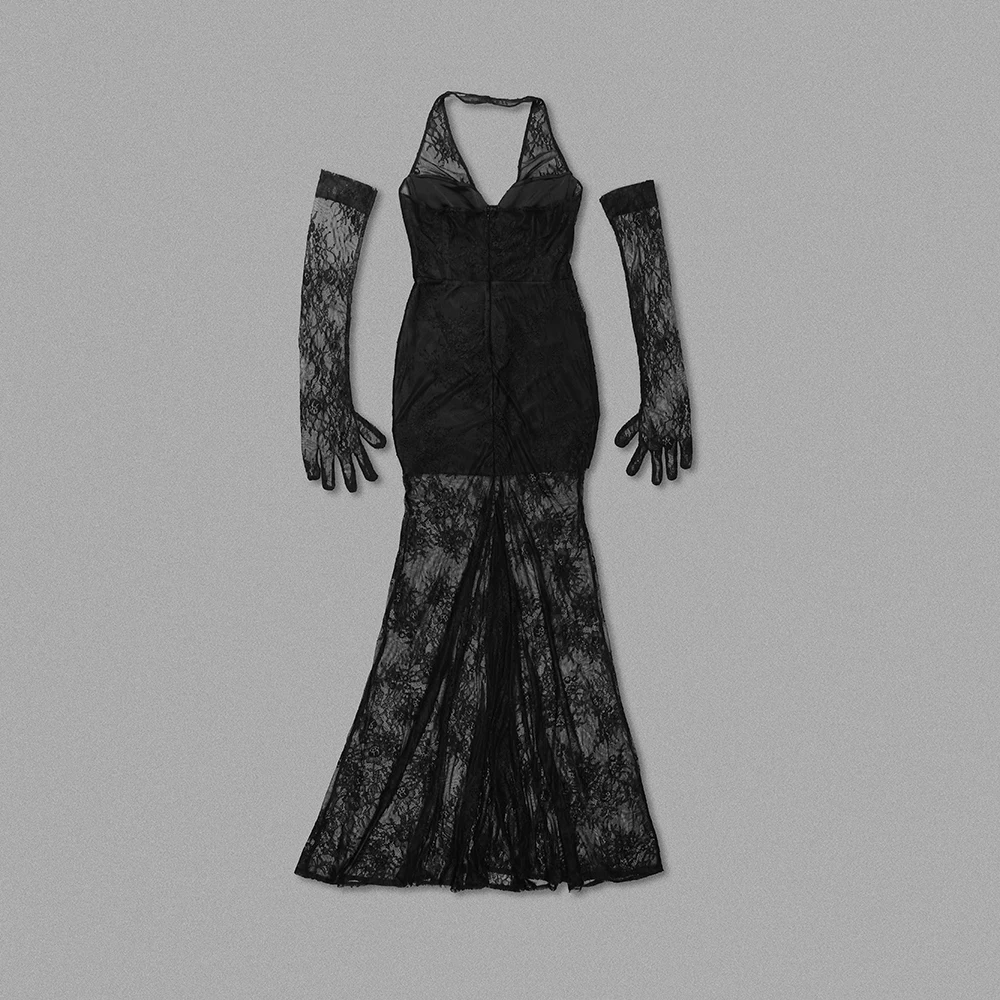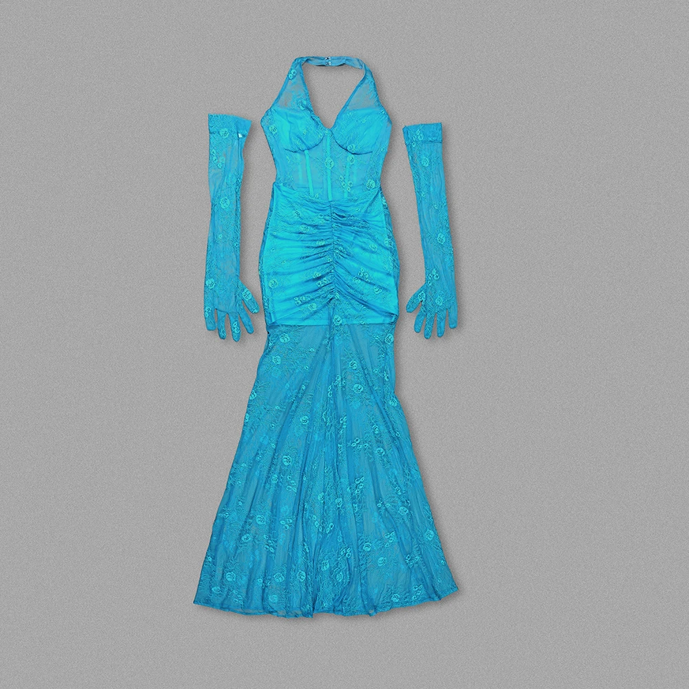 Fleepmart 2024 New Spring Skyblue Black Women Sexy Lace Bodycon Long Mermaid Dress Gloves Elegant Evening Party Celebrate Dress