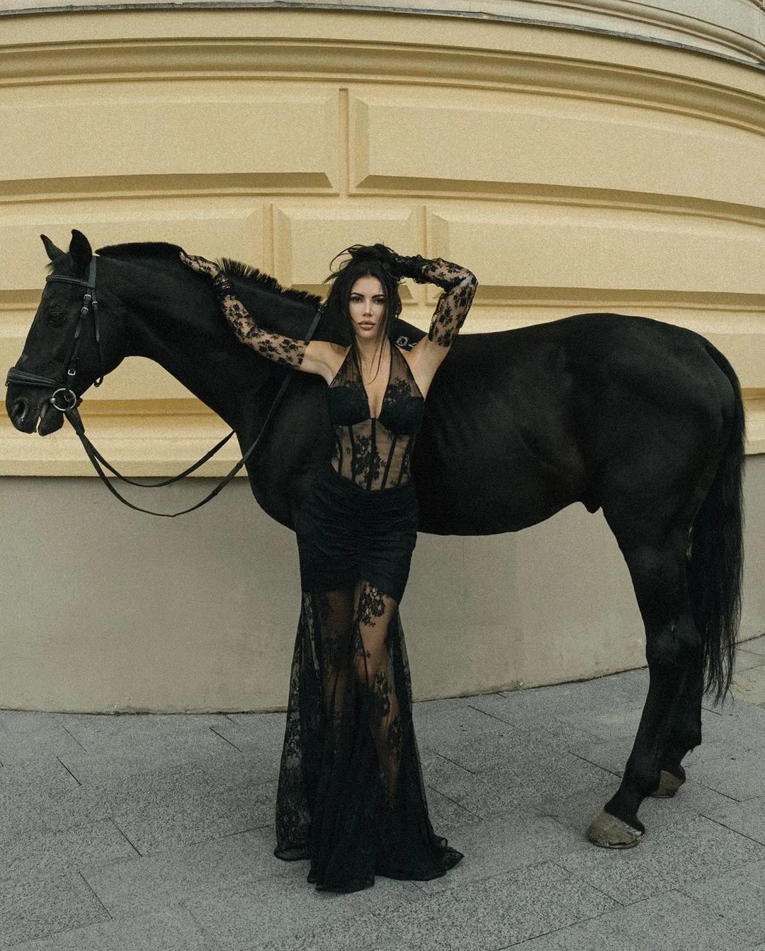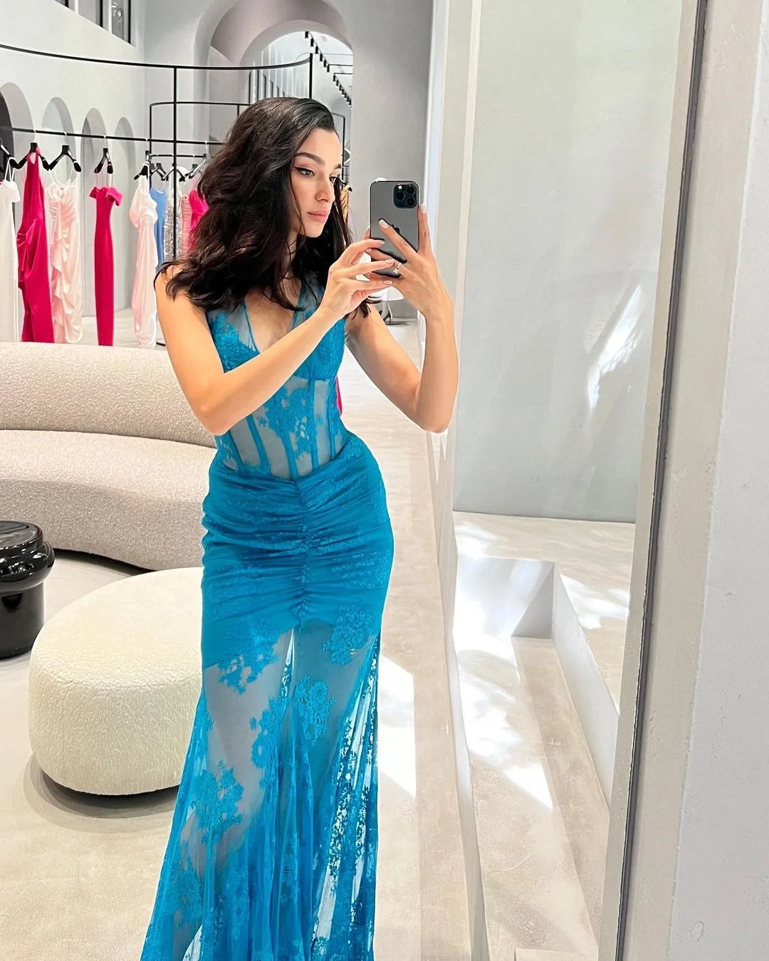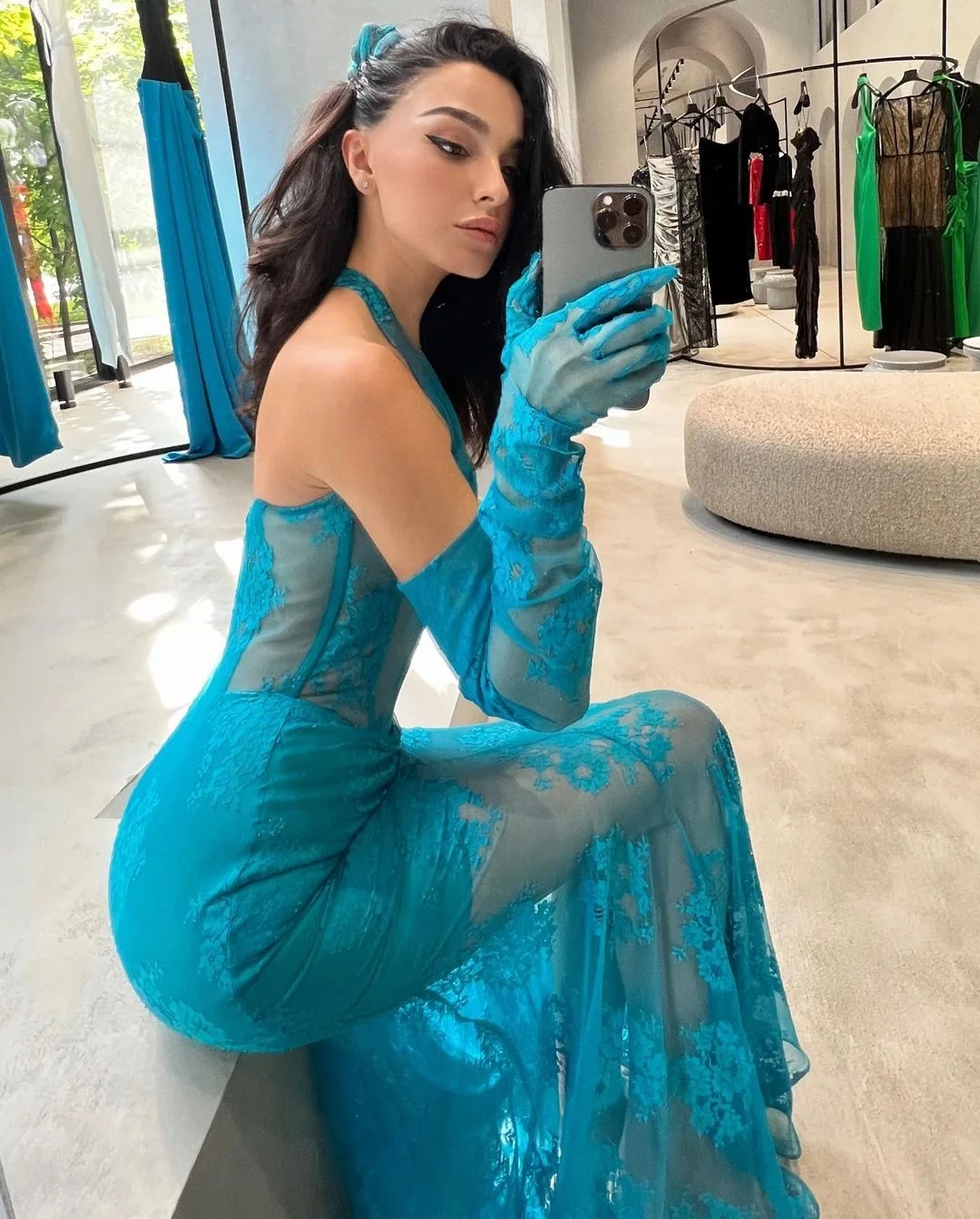 Fleepmart 2024 New Spring Skyblue Black Women Sexy Lace Bodycon Long Mermaid Dress Gloves Elegant Evening Party Celebrate Dress