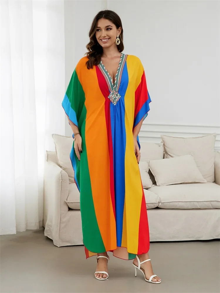 Fleepmart 2024 Summer Colorful Stripe Batwing Sleeve Loose Kaftan Dress For Women Clothing Bohemian Bathrobe Beachwear Maxi Dresses
