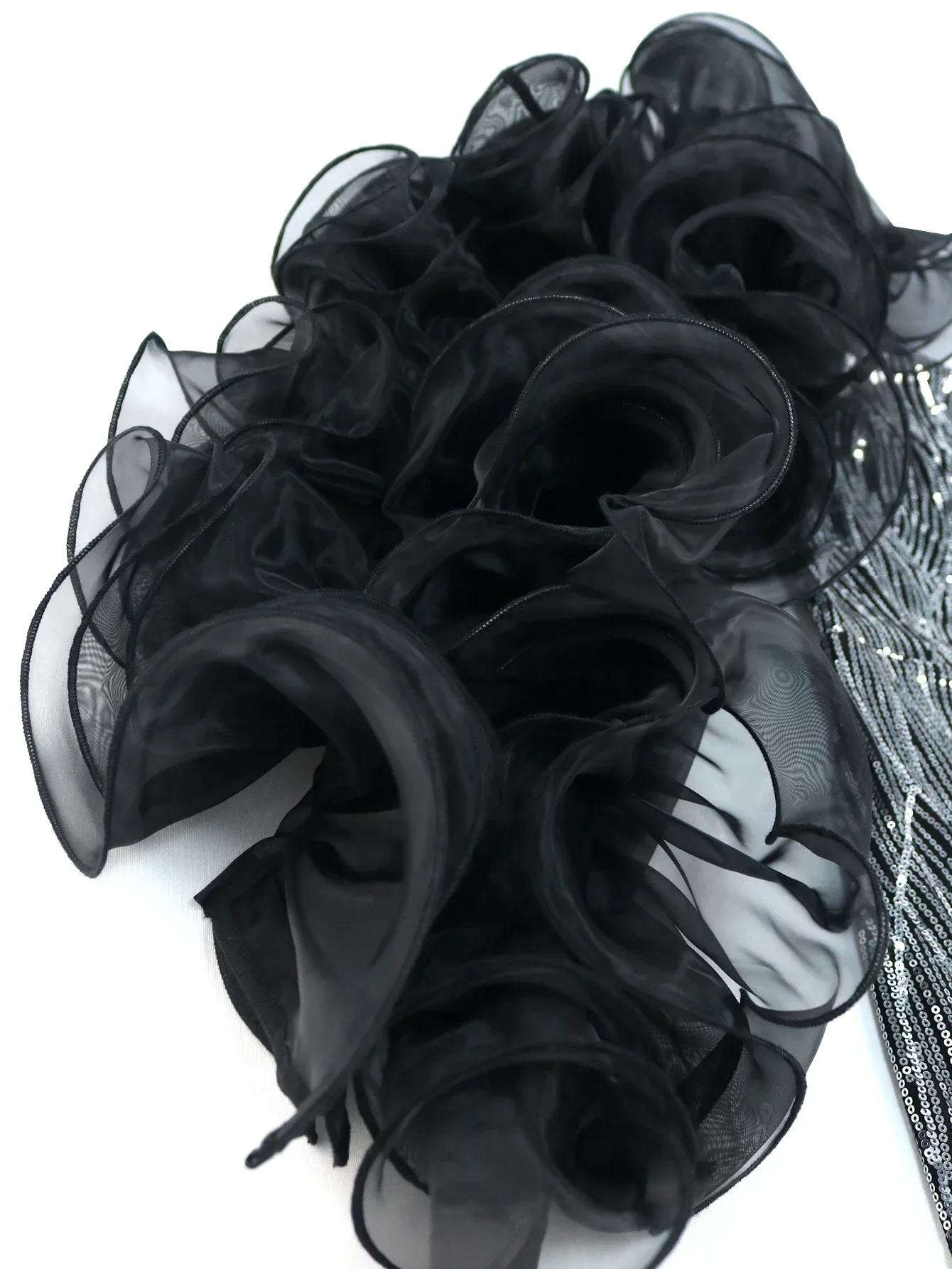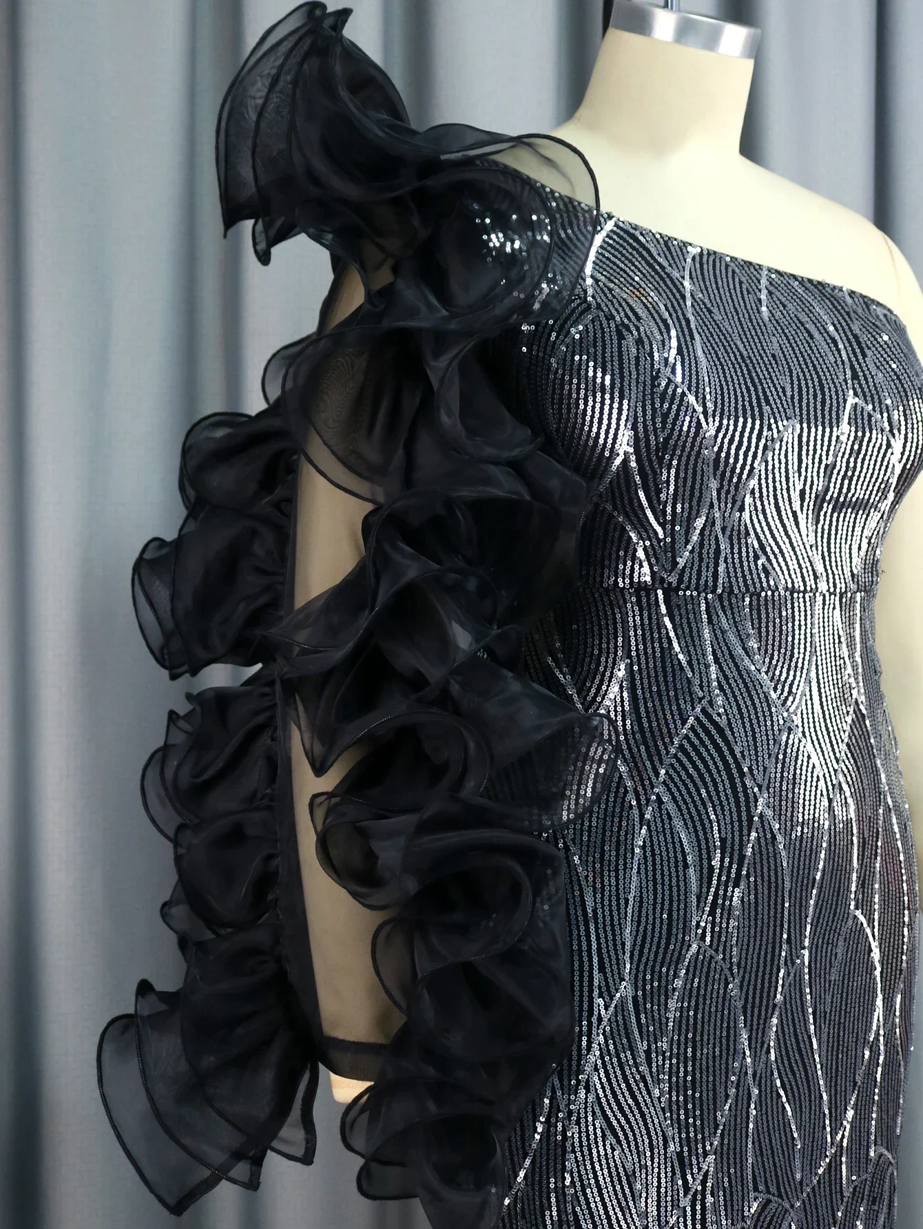 Fleepmart 2024 Trendy Formal Luxury Sequin Dress Women Elegant One Shoulder Black Mesh Ruffle Sleeve Maxi Gown Evening Prom Cocktail Robe