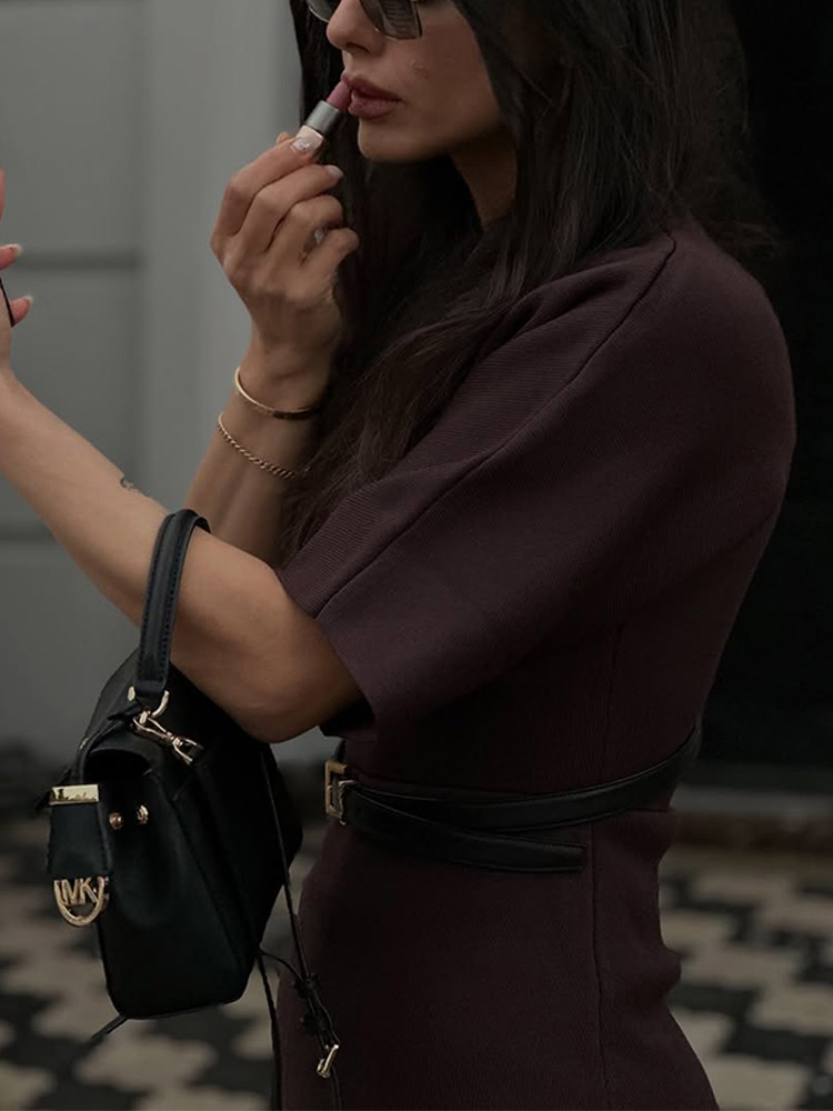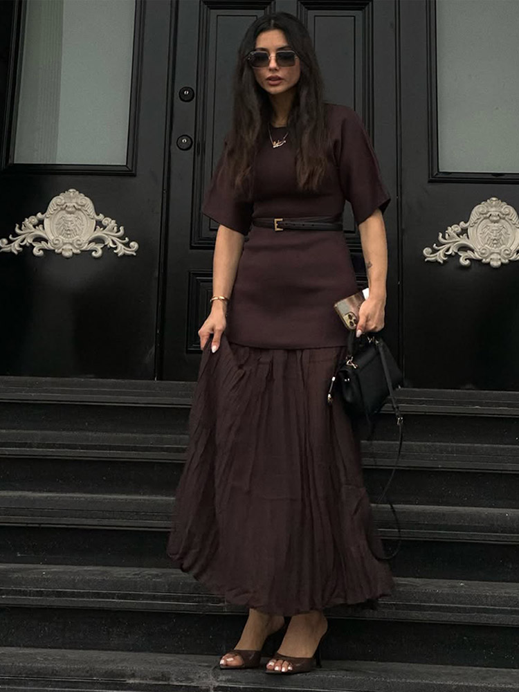 Fleepmart 2025 Chic Splicing Brown Half Sleeve Maxi Dress Women’s Casual Pleated A-line Slim Vestidos Female Office Commute Street Robes