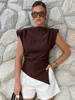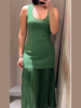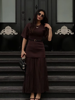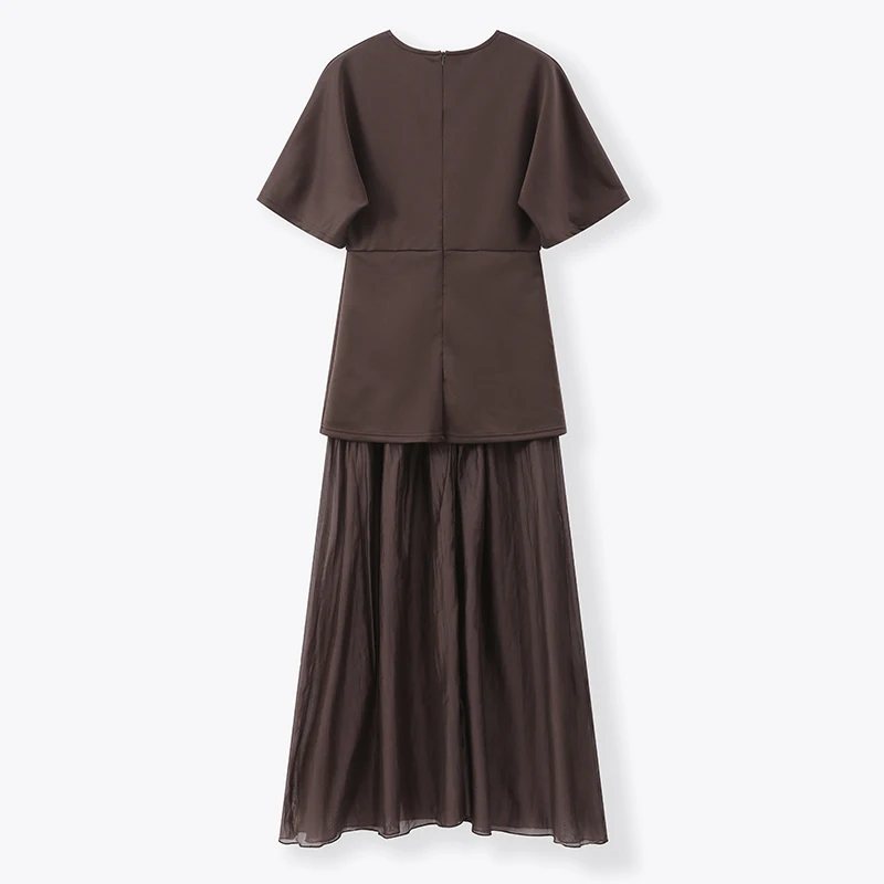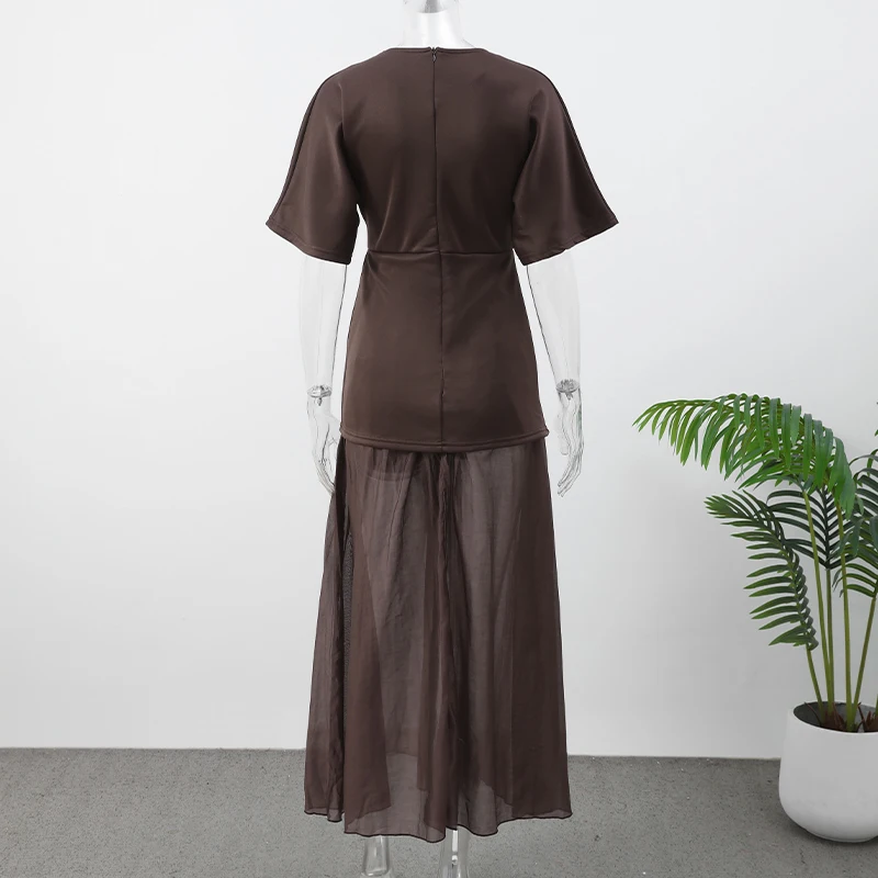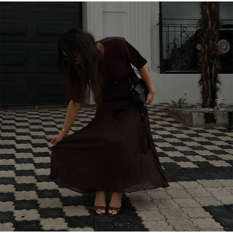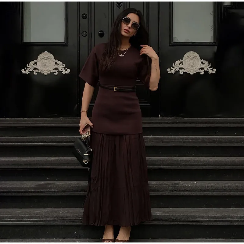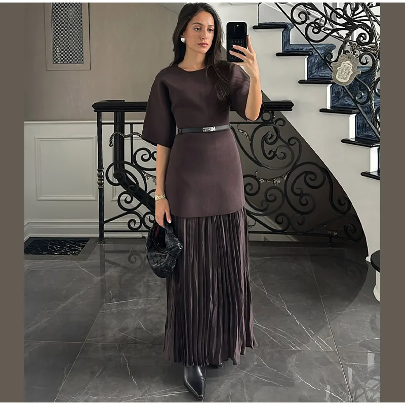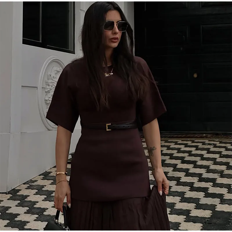 Fleepmart 2025 Chic Splicing Brown Half Sleeve Maxi Dress Women’s Casual Pleated A-line Slim Vestidos Female Office Commute Street Robes