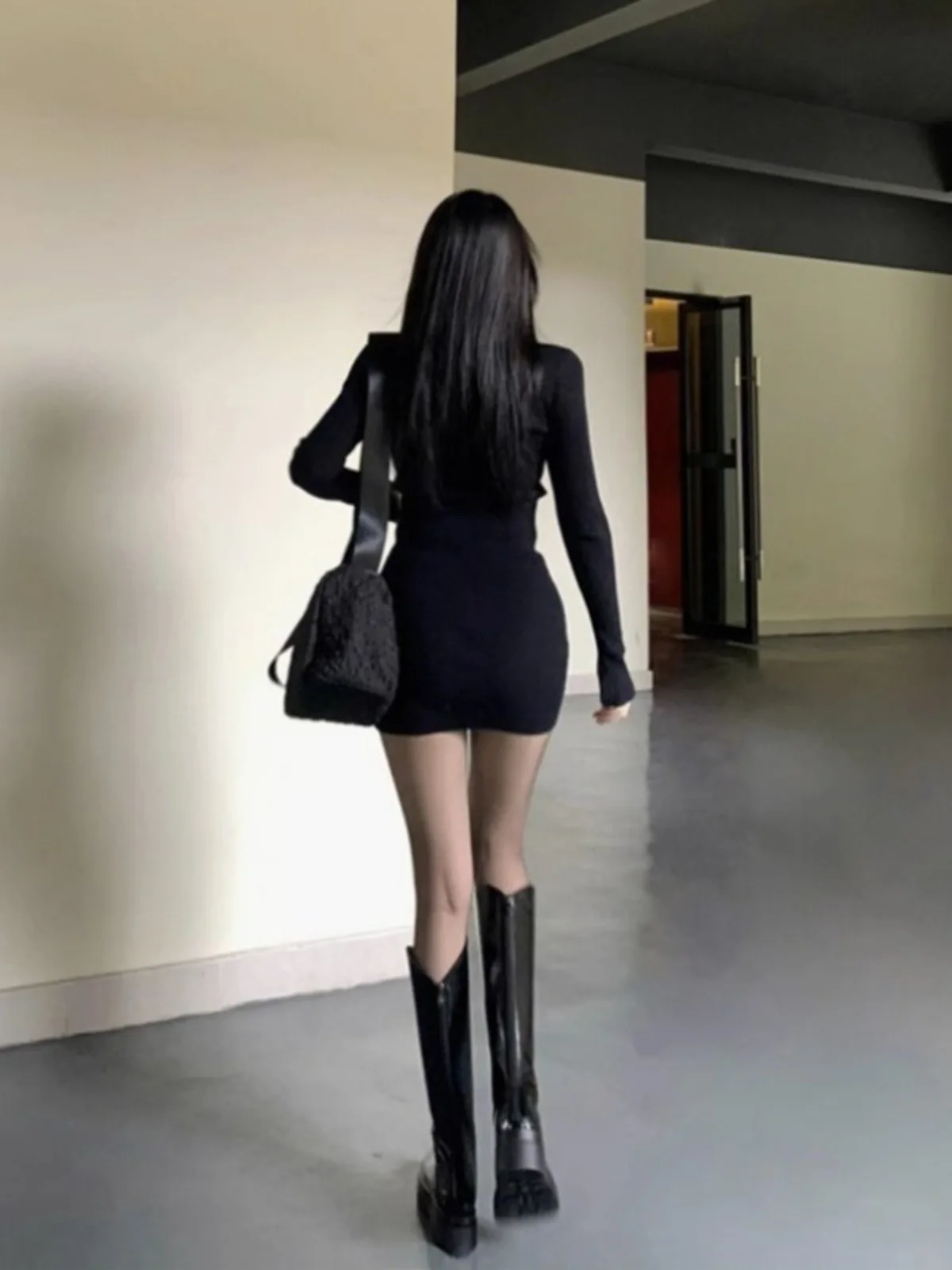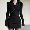 Fleepmart 2025 Minimalist Black Ribbed Knit Dress, Half – Zip Long – Sleeve Bodycon Dress, Women’s Daily Elegant Wear