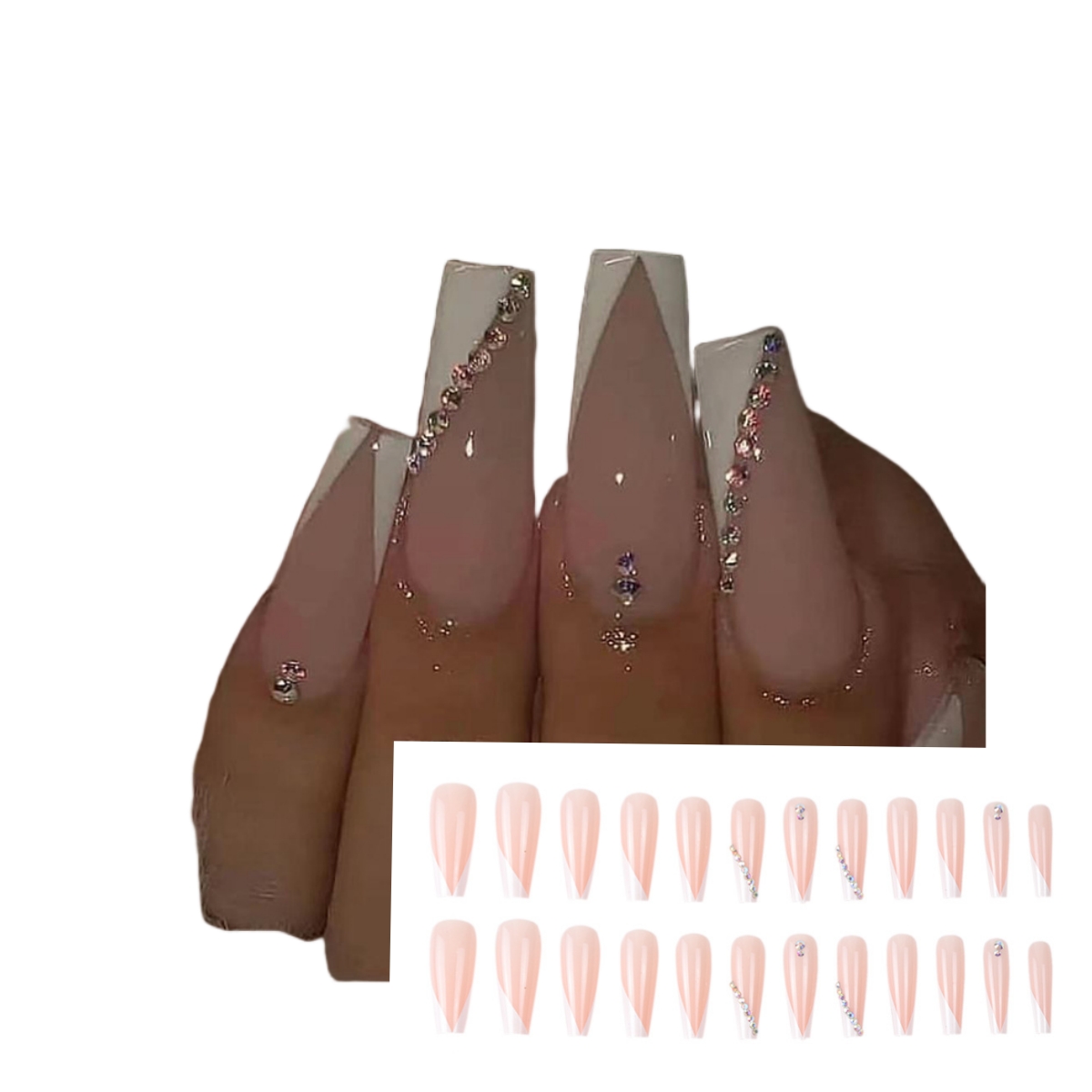 24Pcs/Set Long ballet point drill French Girls nail art white V-shaped fake nails patch new manicure Press On Nails With Designs Artificial Wearing Reusable False Nails