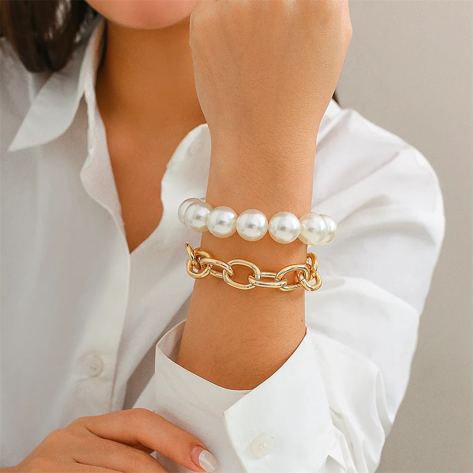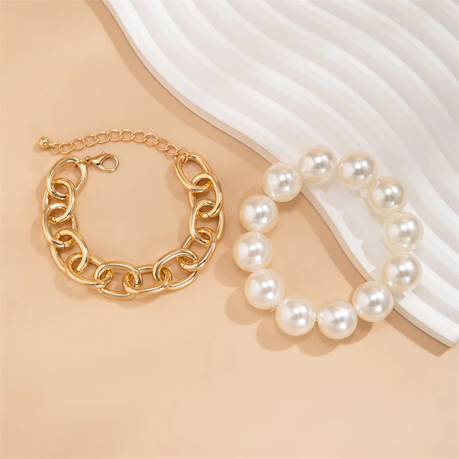 Fleepmart 2Pcs Punk Cuban Curb Metal Chain Bracelet for Women Goth Imitation Pearl Charm Link Bangles Couple Friends Jewelry Gift