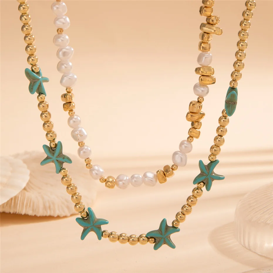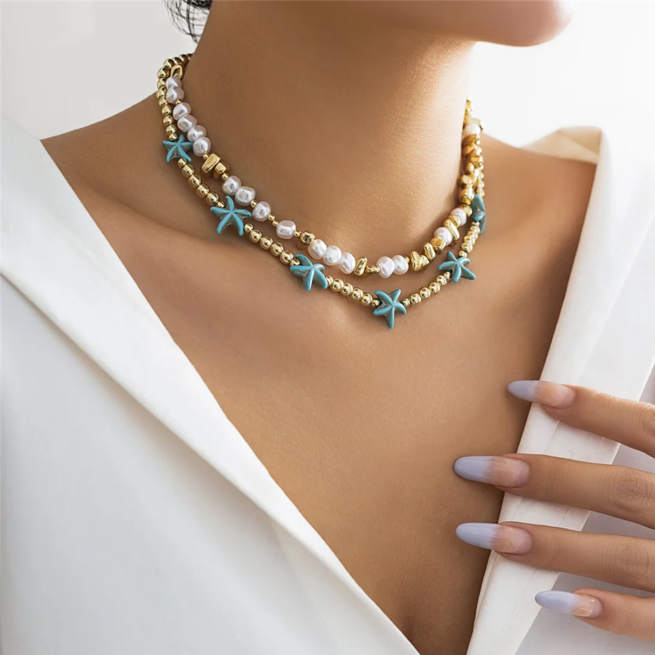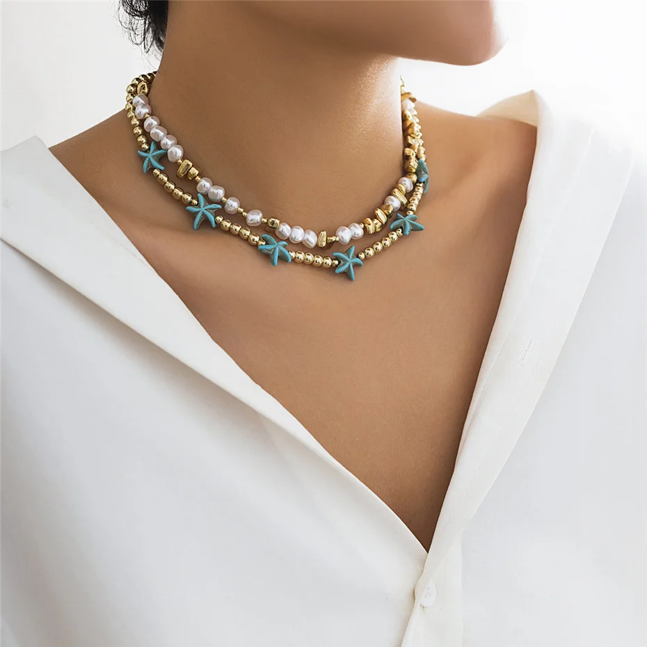 Fleepmart 2Pcs/Set Boho Ocean Blue Starfish Star Beads Chain Necklace for Women Kpop Imitation Pearl Choker Aesthetic Beach Y2K Jewelry