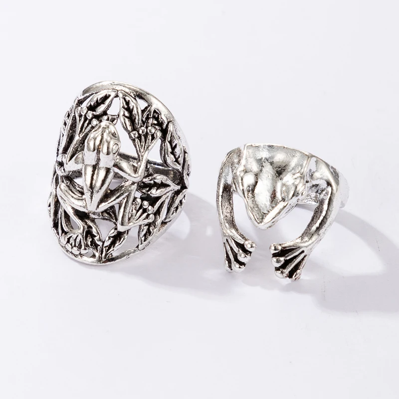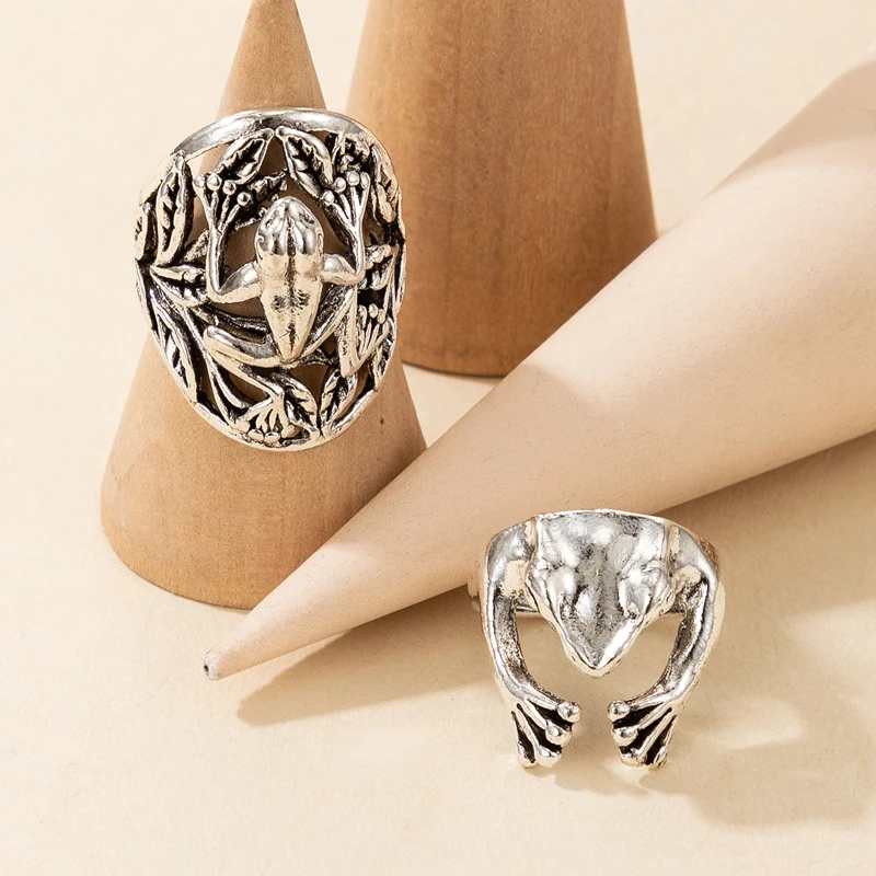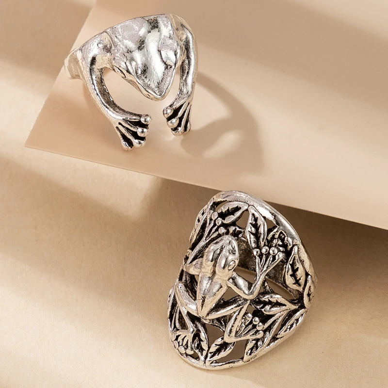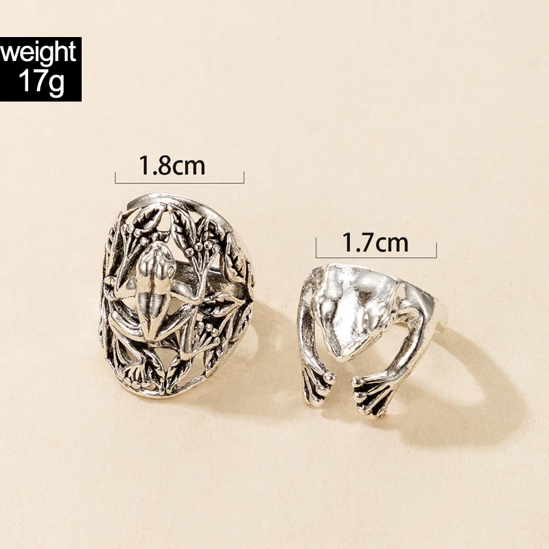 Fleepmart 2pcs/sets Frog Ring Sets for Women Charms Toad Vintage Silver Color Alloy Metal Hollow Goemetric Jewelry