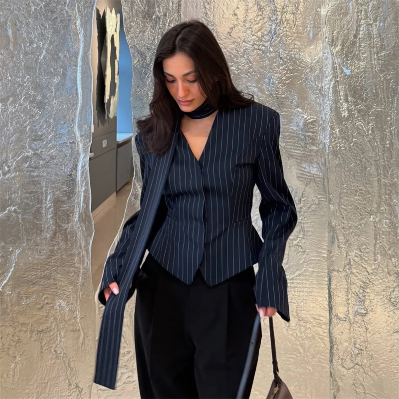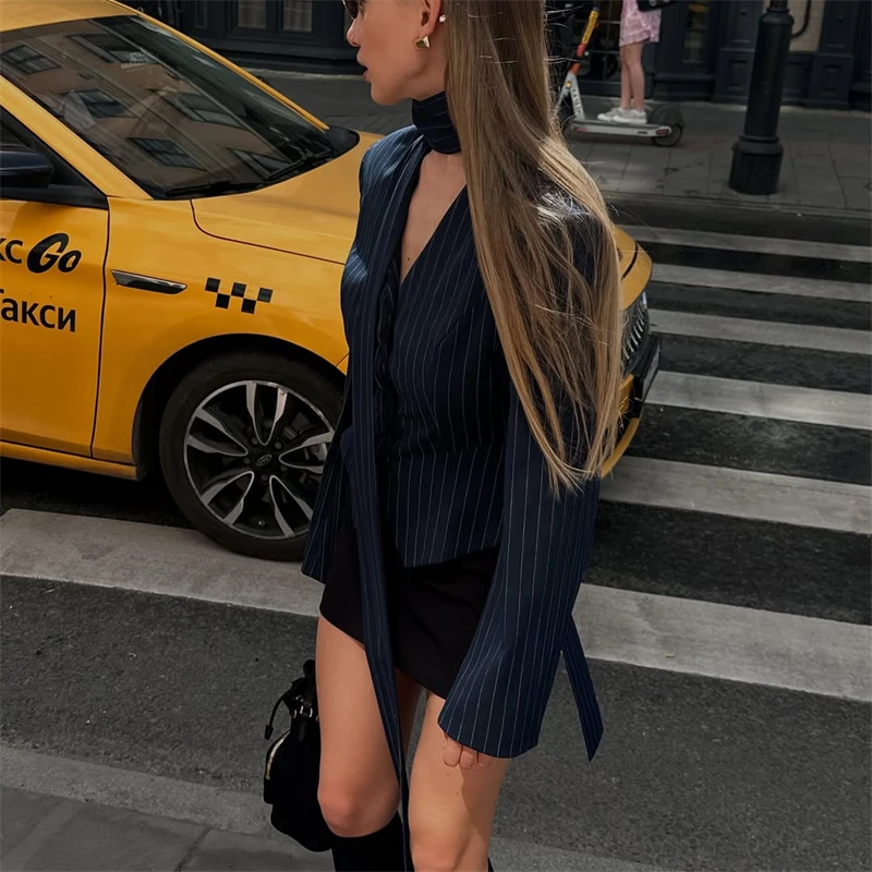 Fleepmart 3 Piece Dress Set Women Elegant V-Neck Striped Ribbon Blazer Slim Short Dress Set Fashion Luxury Women Party Dress Set