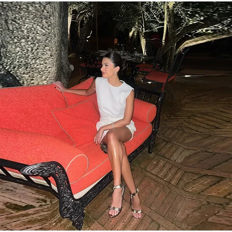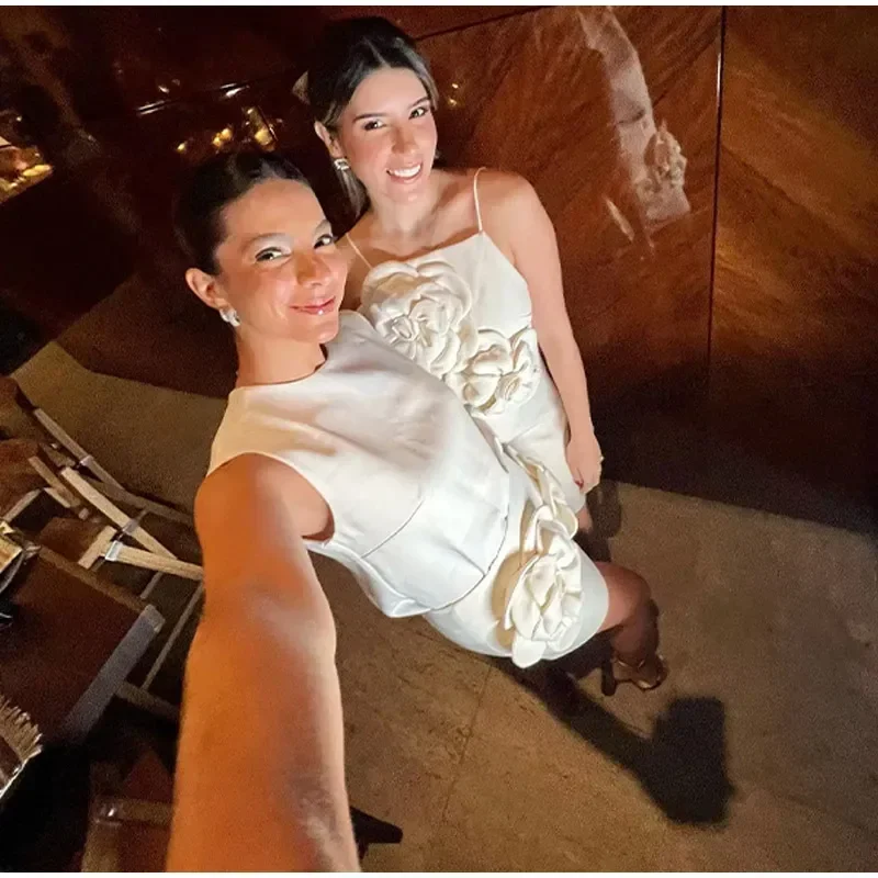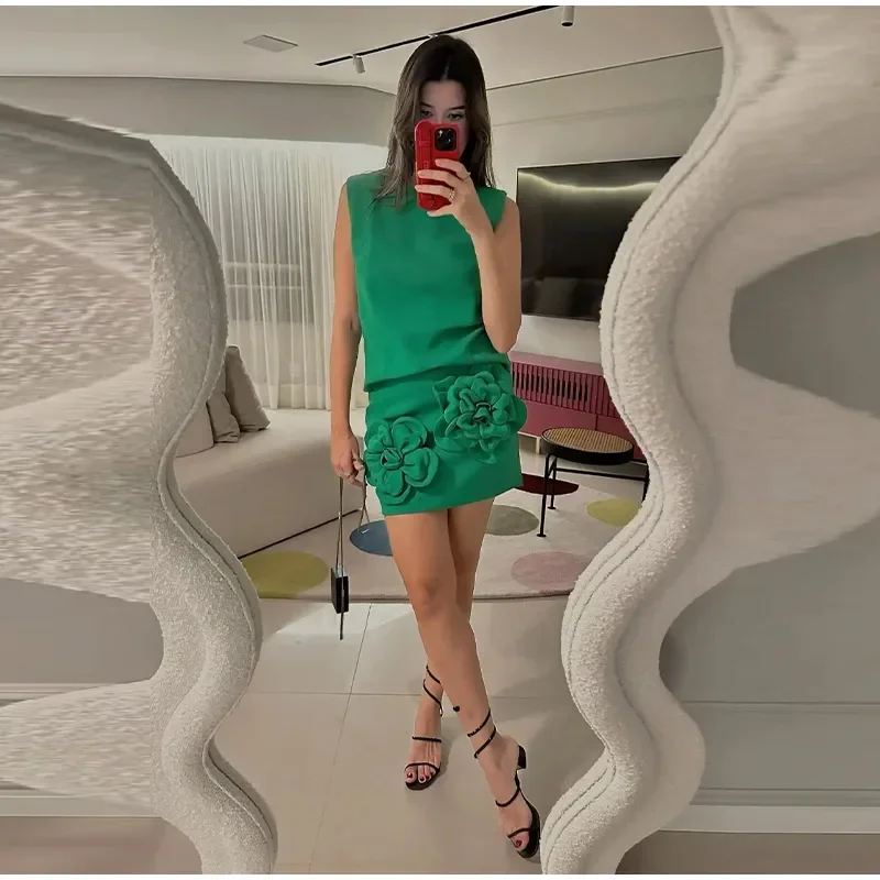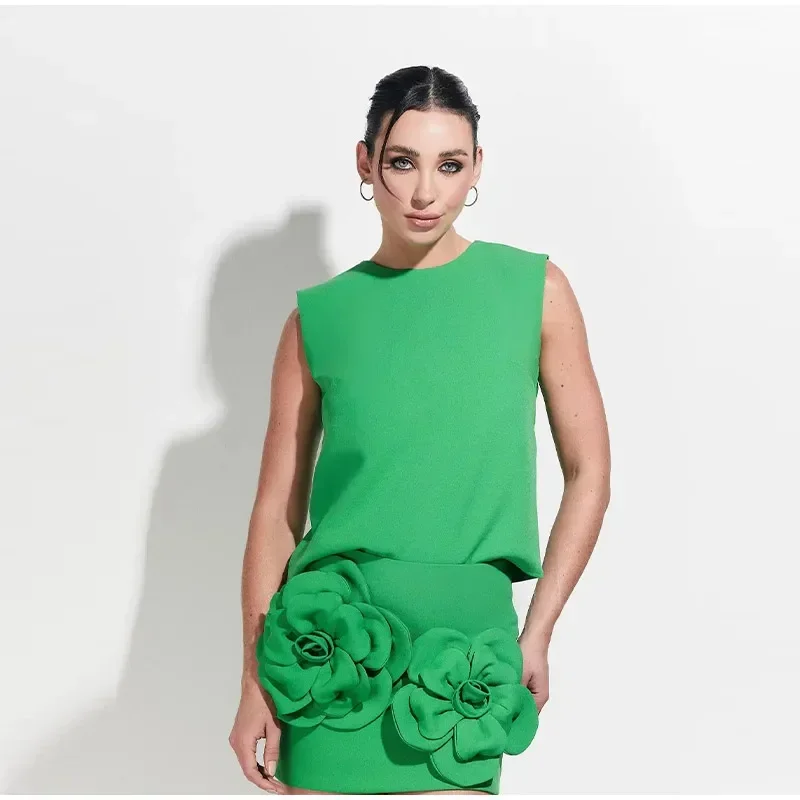 Fleepmart 3D Floral Mini Skirt 2 Piece Set Women Solid O-neck Sleeveless Top Short Shirts Suit 2024 Spring Summer Lady Elegant Streetwear