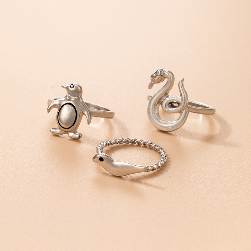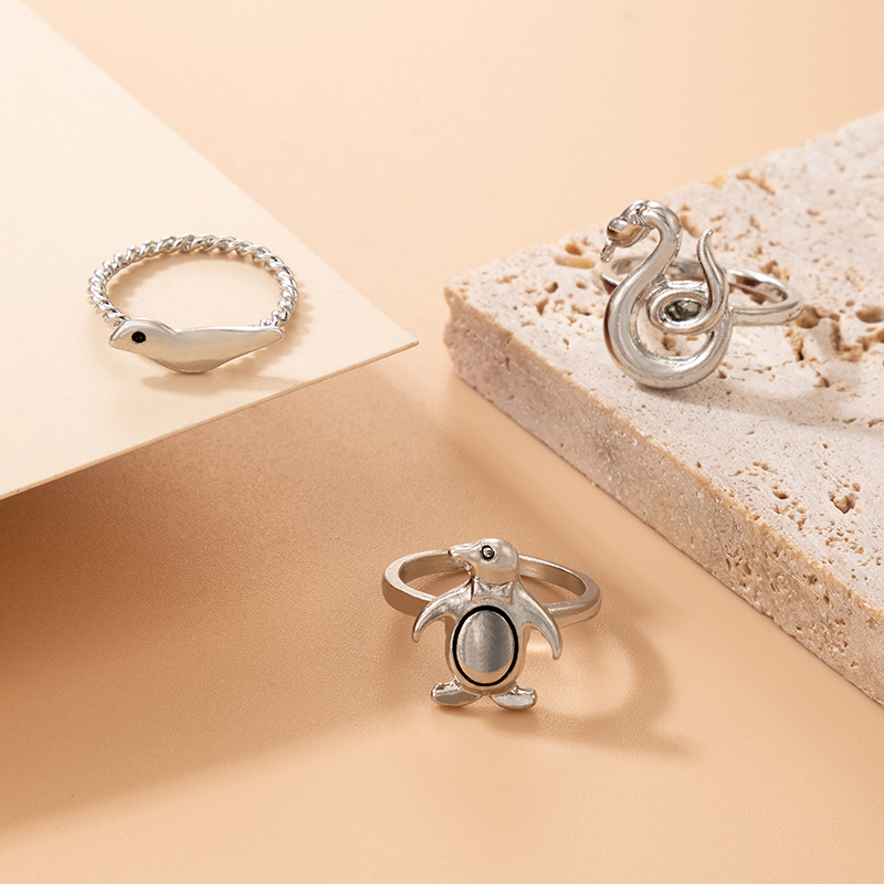 Fleepmart 3pcs/sets Lovely Penguin Snake Ring Sets for Women Charms Silver Color Bird Animal Alloy Metal Party Jewelry Anillo