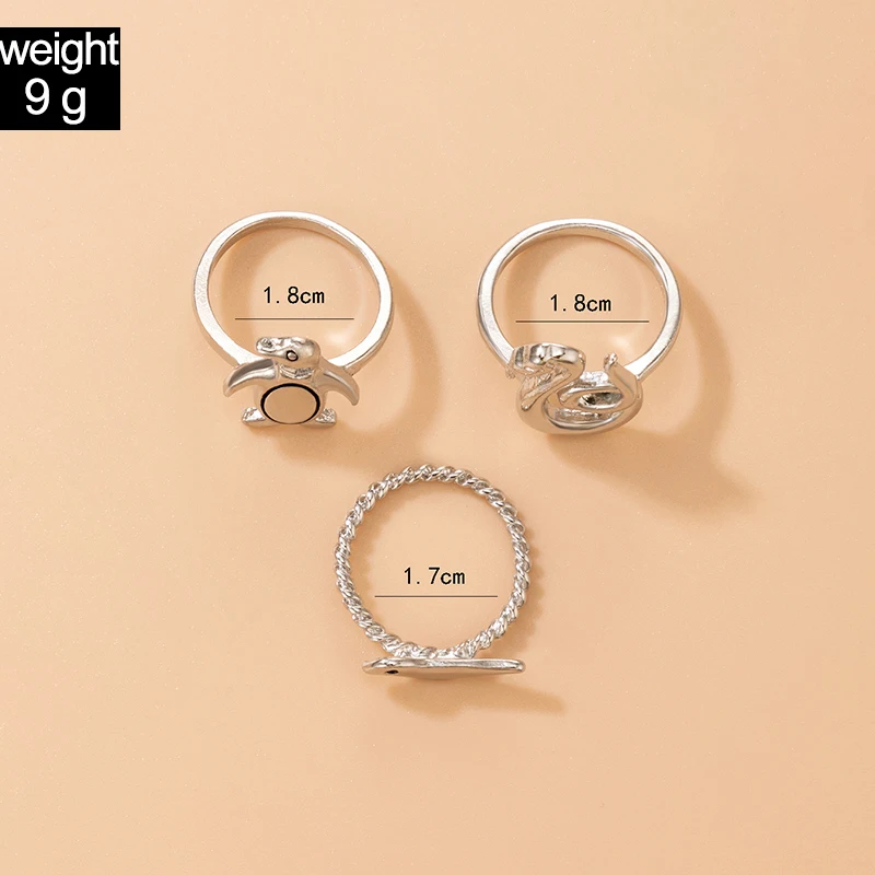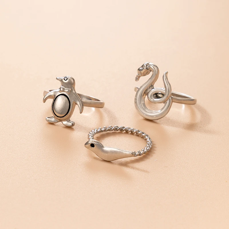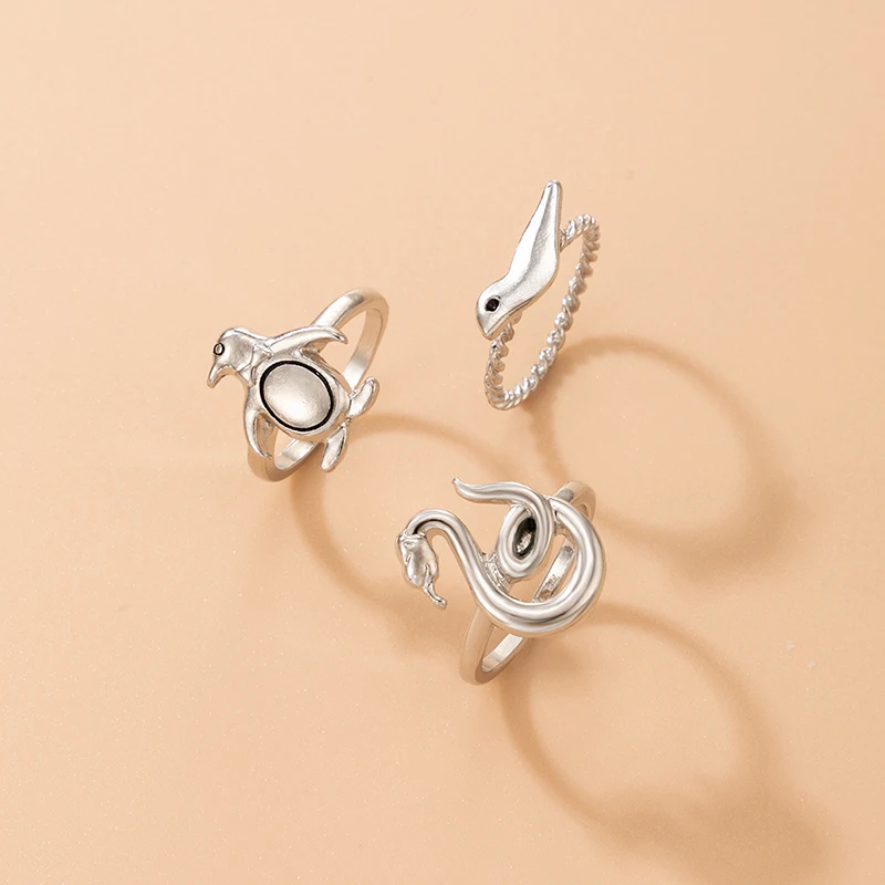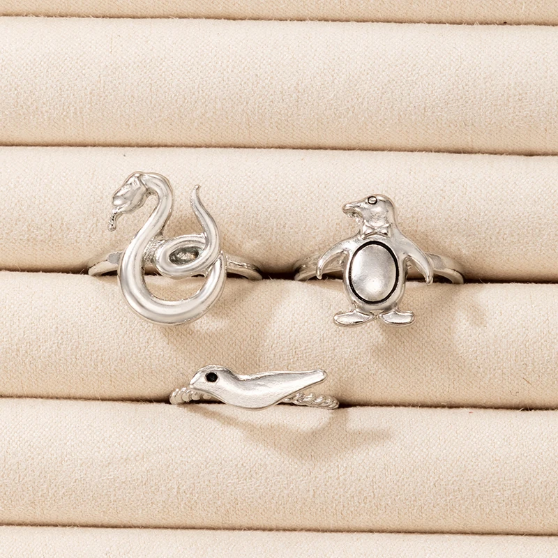 Fleepmart 3pcs/sets Lovely Penguin Snake Ring Sets for Women Charms Silver Color Bird Animal Alloy Metal Party Jewelry Anillo