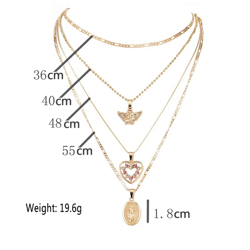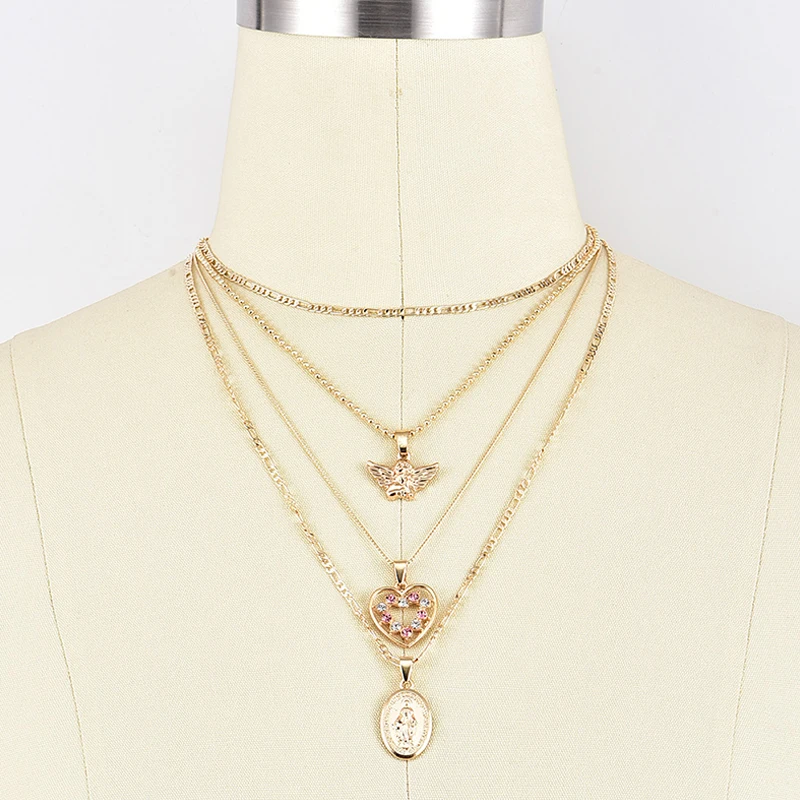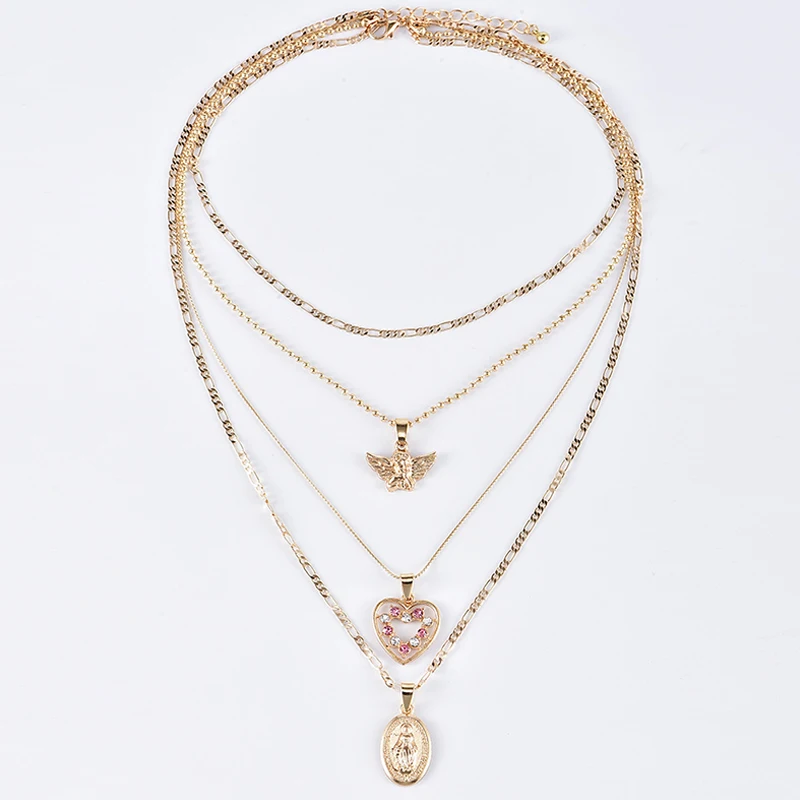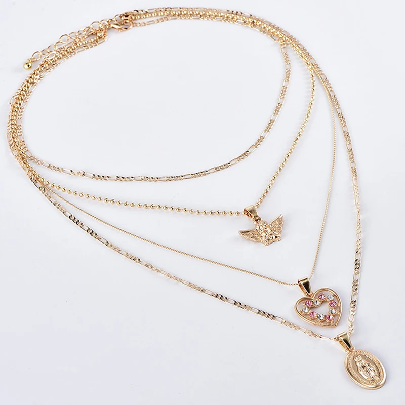 Fleepmart 4 Pcs/Set Fashion Necklaces Boho Retro Peach Heart Crystal Virgin Mary Pendant Angel Wings Gold Necklace Women Charm Jewelry