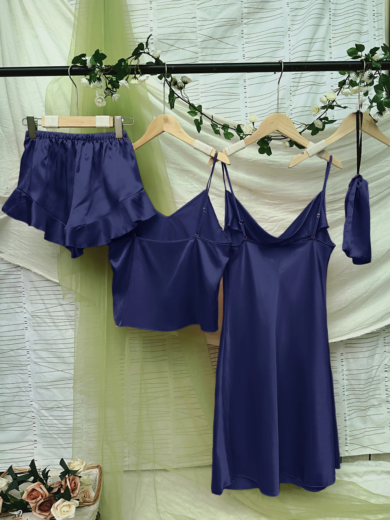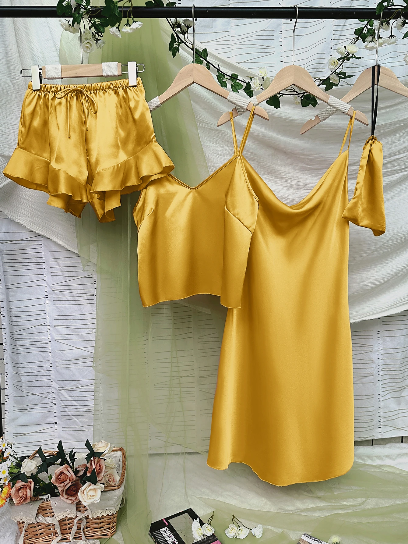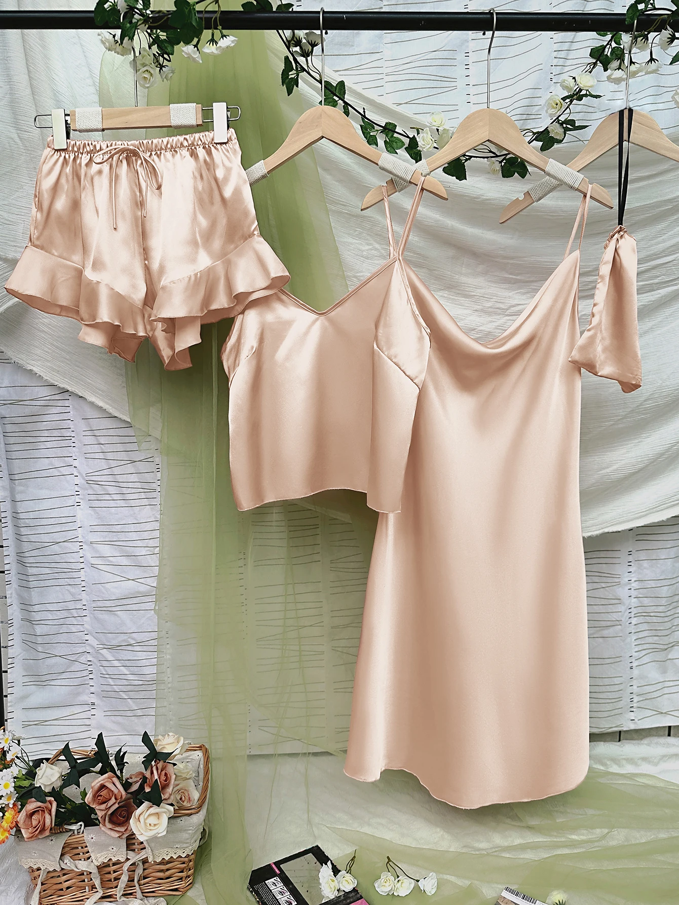 Fleepmart 4 Pieces Casual Comfortable Solid Satin Sleepwear Simple Vocation V Neck Slip Dress Cami Top Shorts Women’s Pajamas SetsFleepmart 4 Pieces Casual Comfortable Solid Satin Sleepwear Simple Vocation V Neck Slip Dress Cami Top Shorts Women’s Pajamas Sets