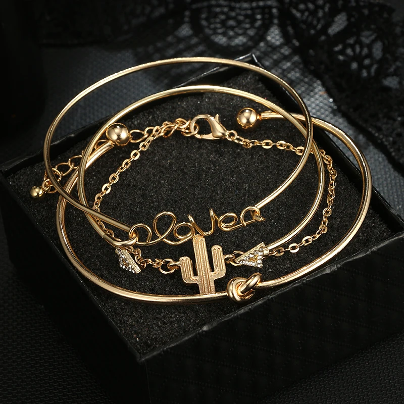 Fleepmart 4pcs/Set Bohemian Bangle Sets Crystal Bangle for Women Letter Knot Charm Hand Cuffs Gold color Bracelet Femme Gift