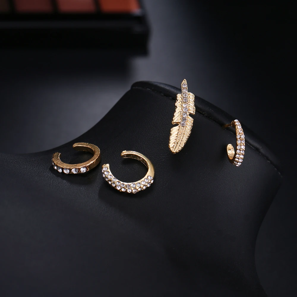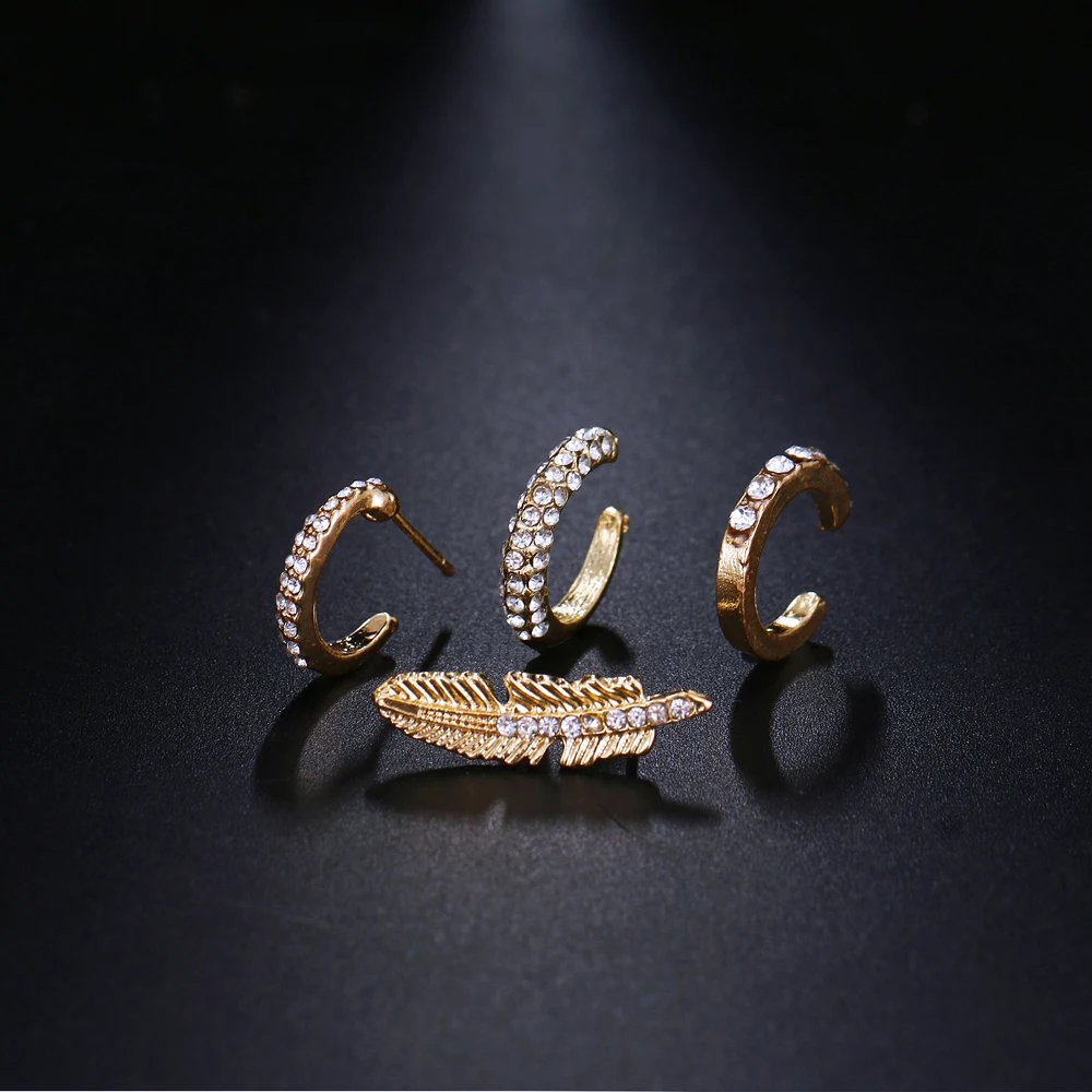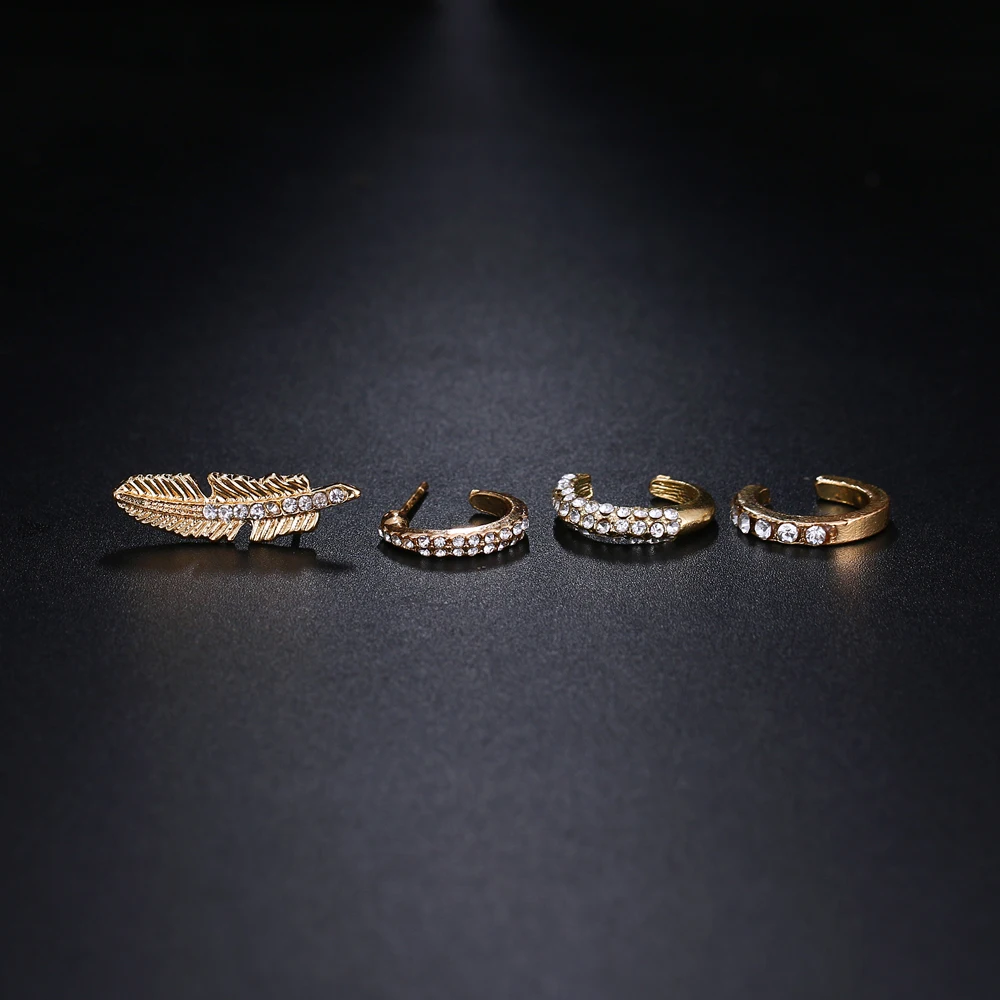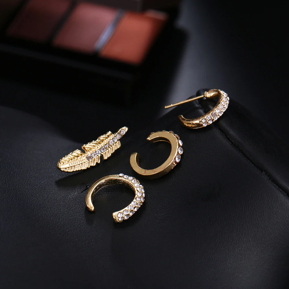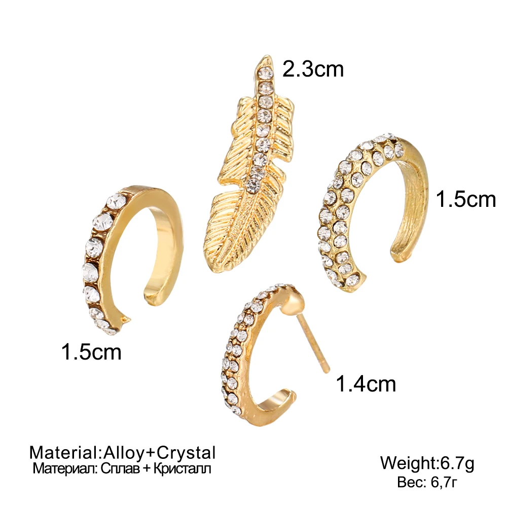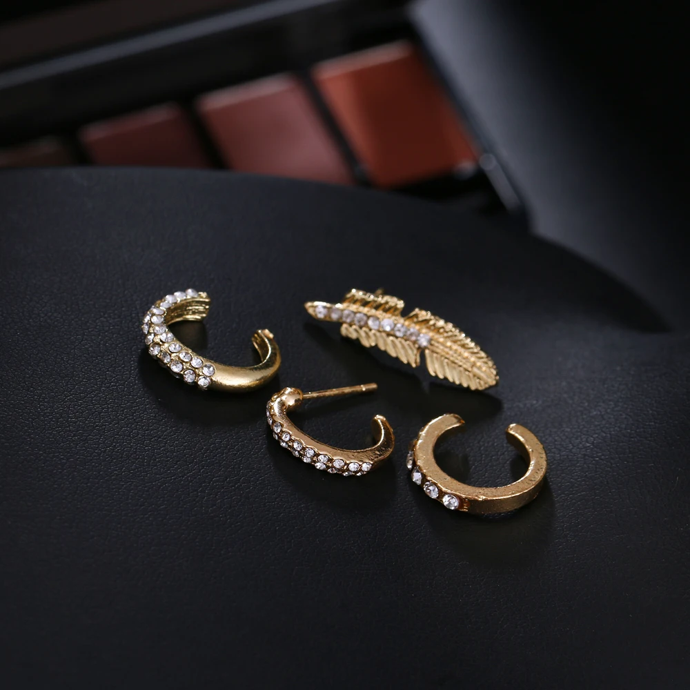 Fleepmart 4pcs/set Bohemian Crystal Feather Stud Earrings for Women Vintage Gold Color Ear Cuff Ethnic Small Earrings Party Jewelry Gift