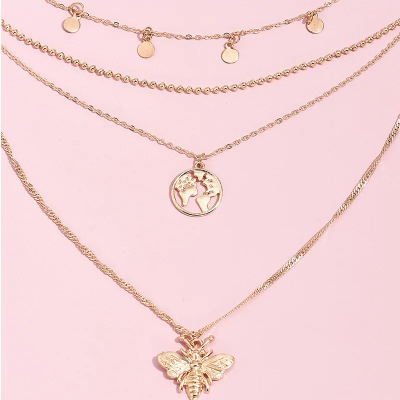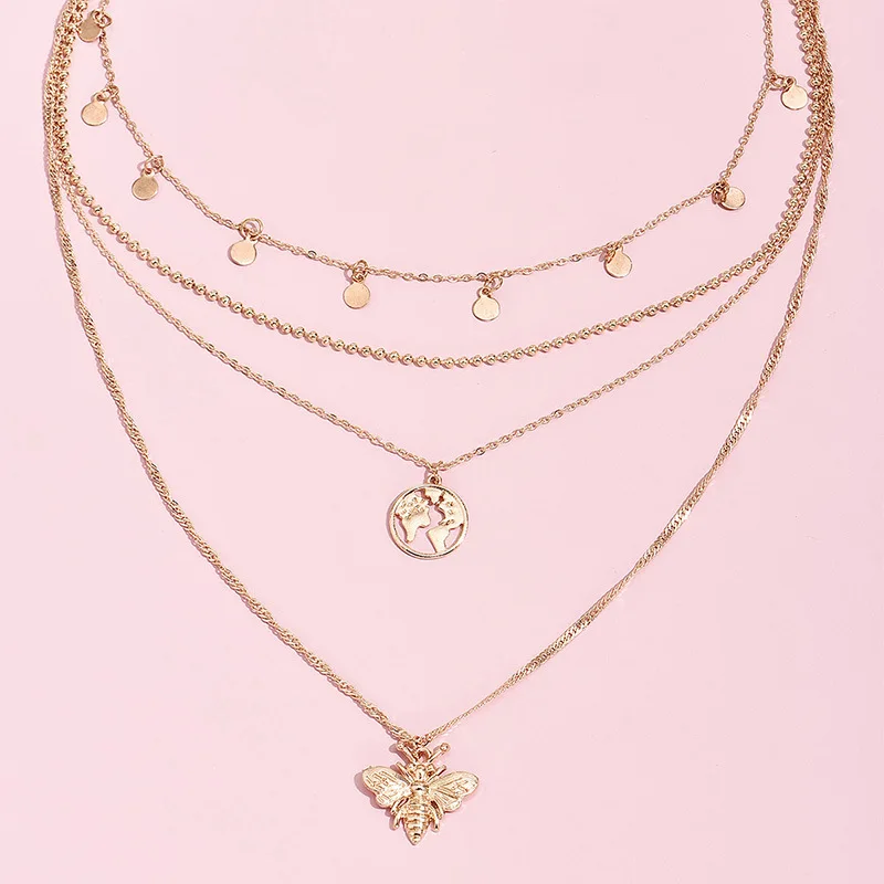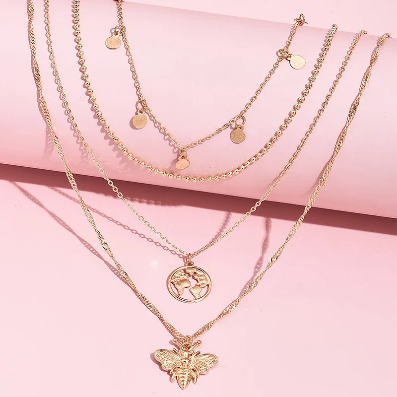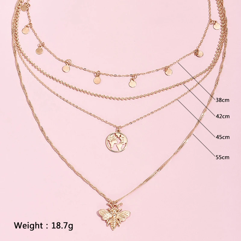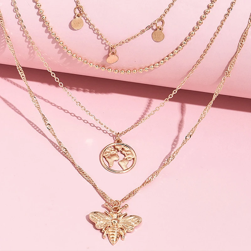 Fleepmart 4Pcs/Set Bohemian Vintage Necklaces Set Women Charm Bee Map Disc Pendant Multilayer Gold Color Beach Necklace Jewelry