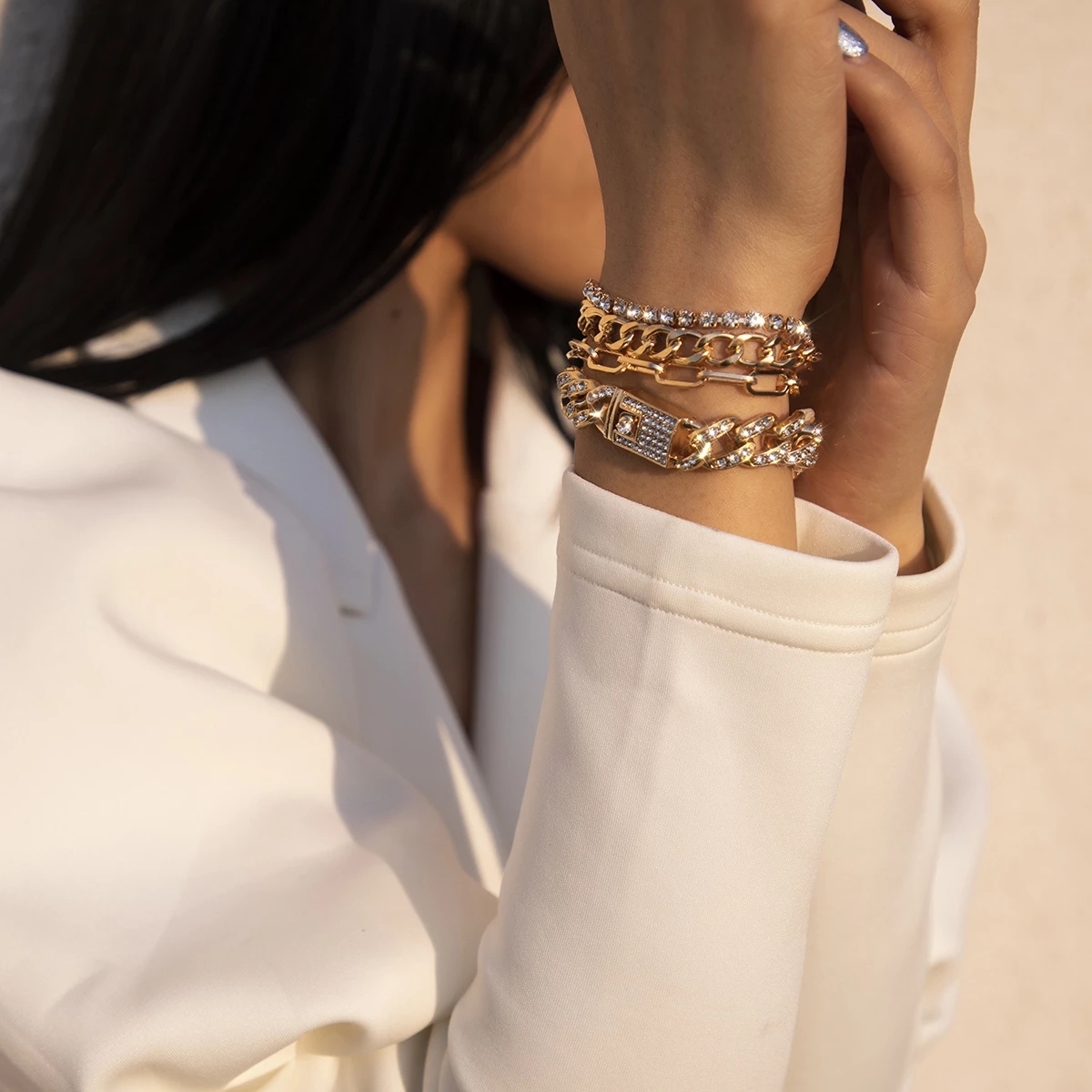 Fleepmart 4Pcs/Set Luxury Shiny Rhinestone Bracelets Set Bangle Women Men Adjustable Clear Crystal Chunky Link Charm Bracelet Hand Jewelry