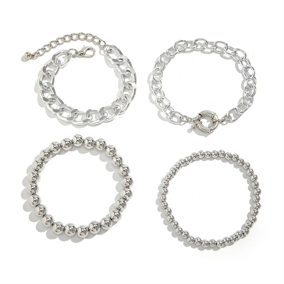 Fleepmart 4Pcs/Set Punk Silver Color Elastic Beads Chain Bracelets for Women Vintage Punk Cuban Chain Bangles Grunge Couple Jewelry Men