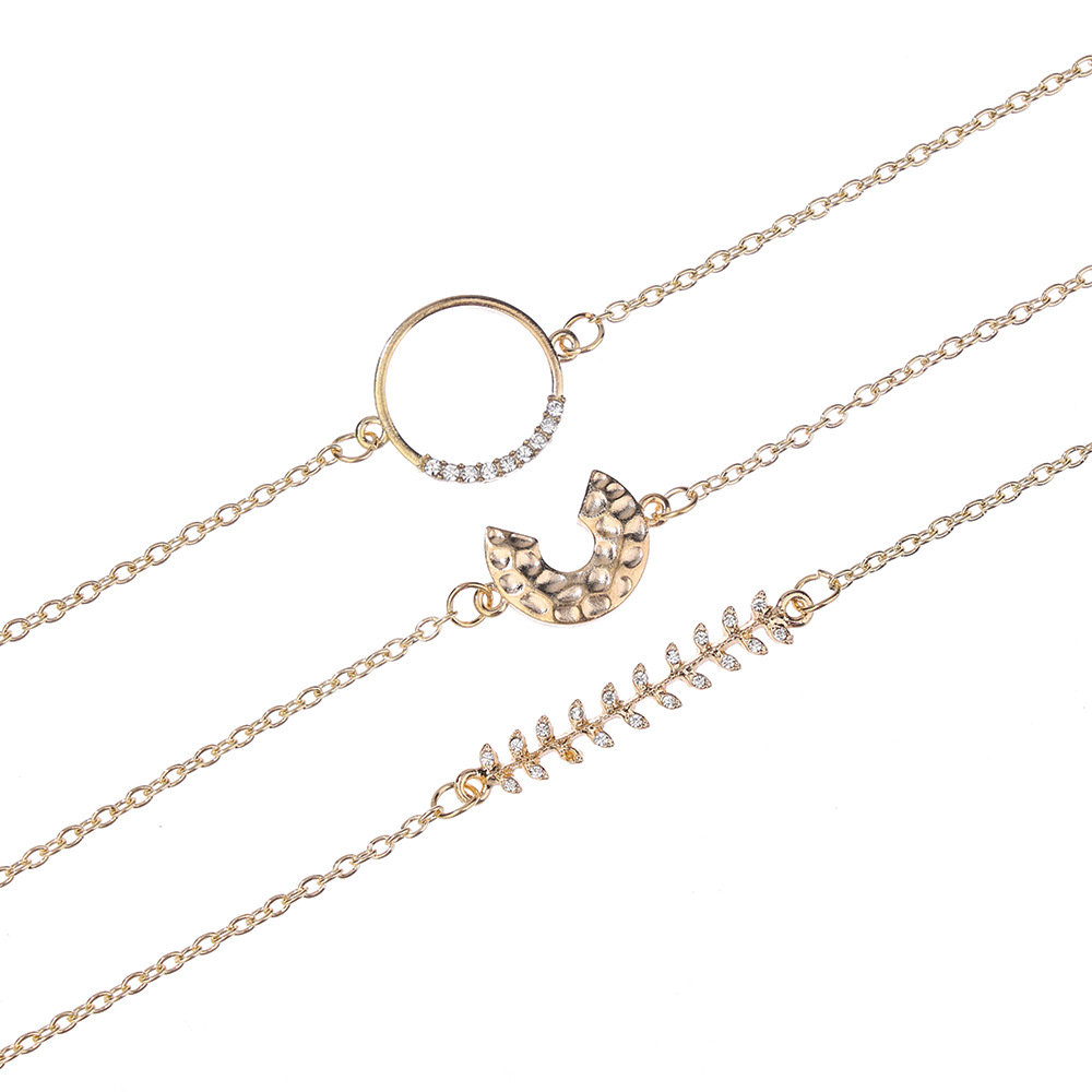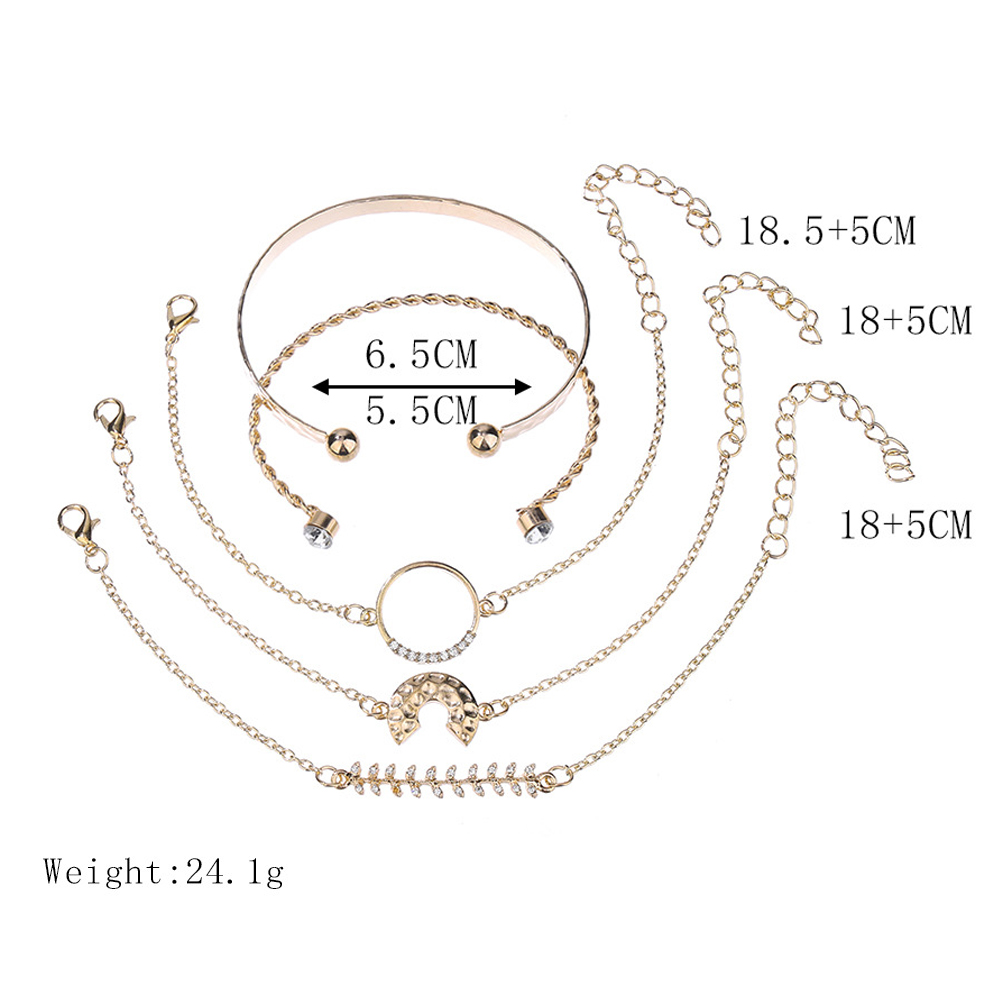 Fleepmart 5 Pcs/Set Women Fashion Crystal Leaf Geometric Chain Gold Bracelet Set Beach Charm Party Jewelry Accessories Length 18+5 CM
