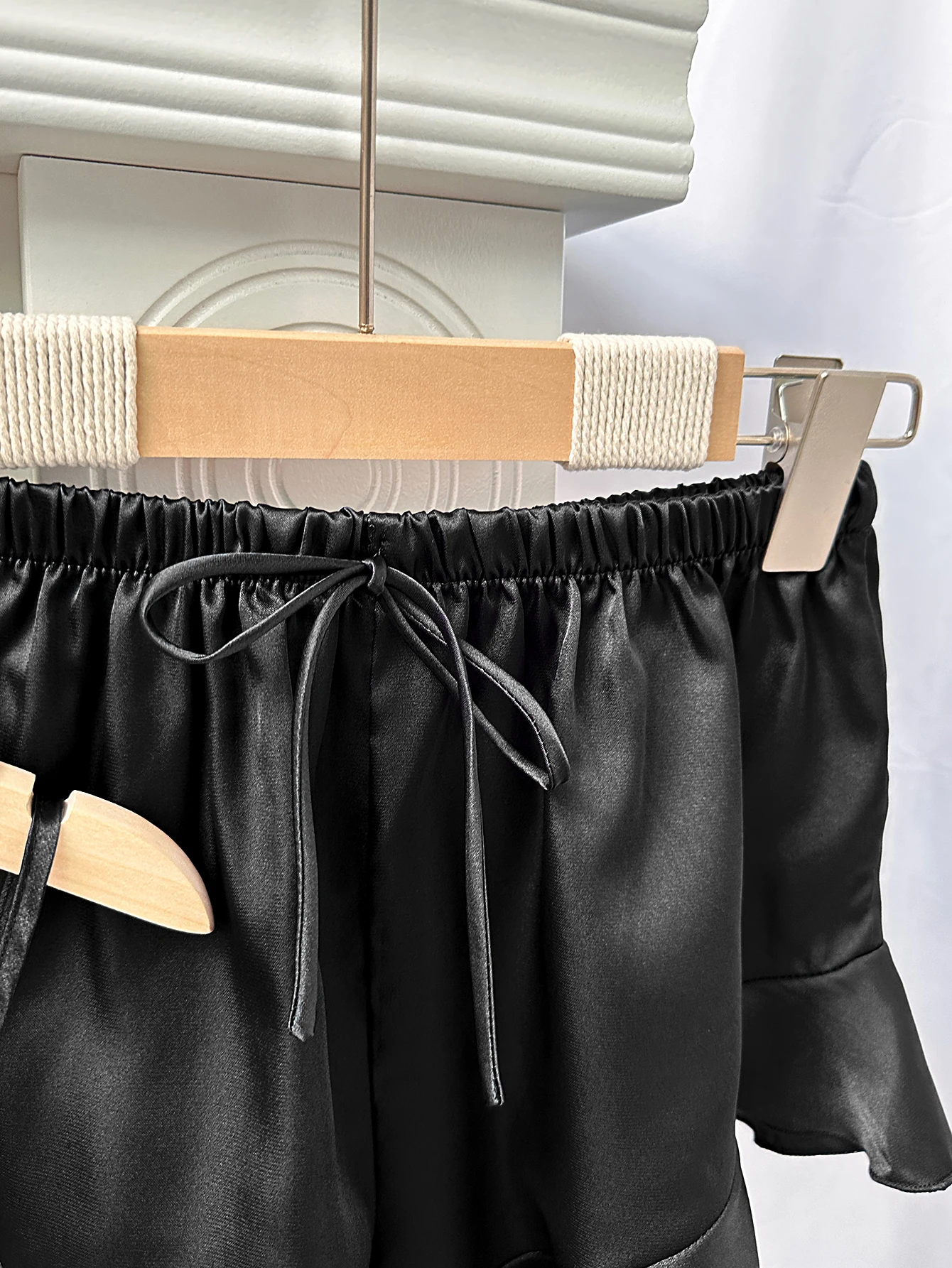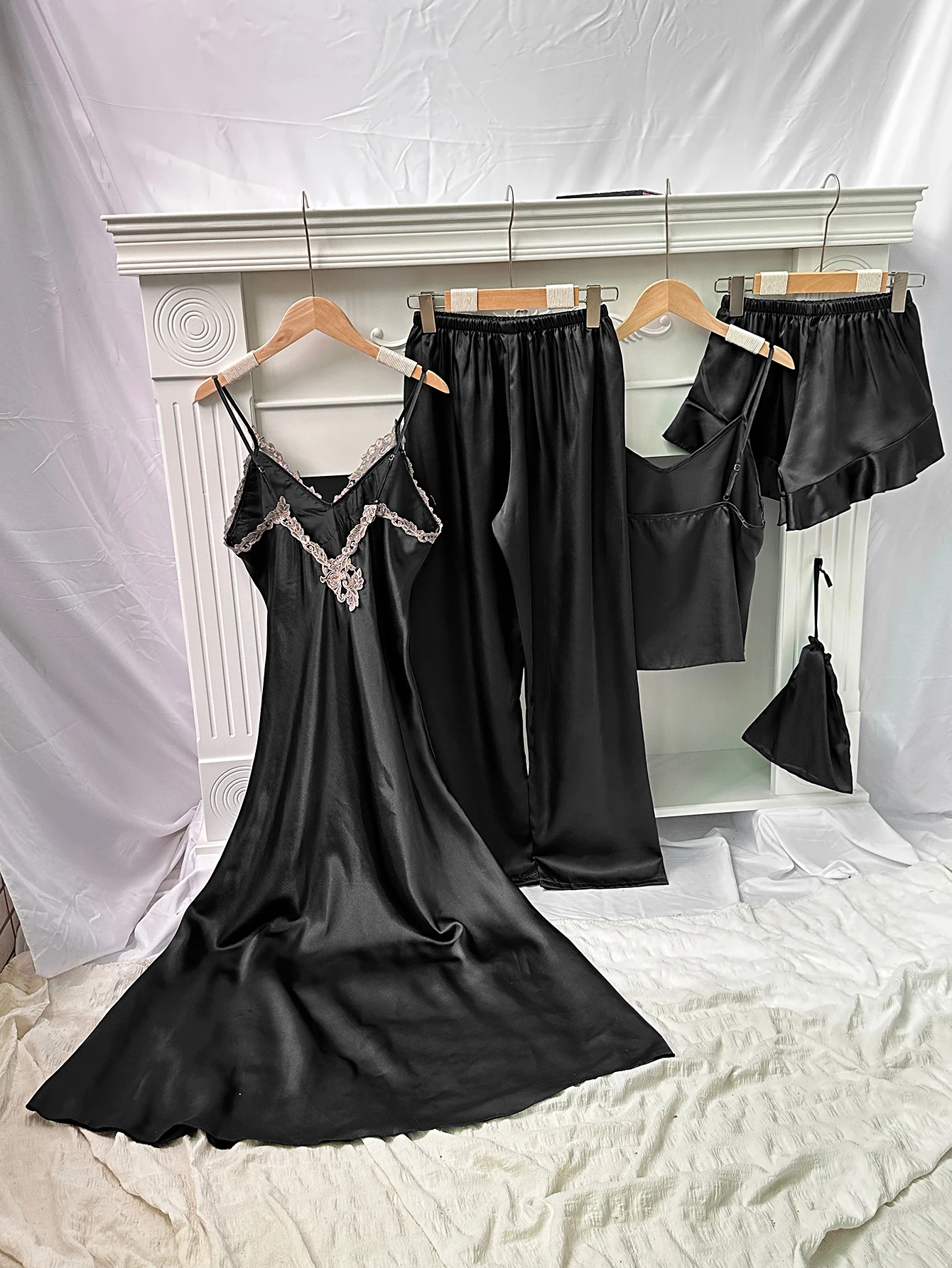 Fleepmart 5 Piece Satin Sleep Set Lace Trim Slip Dress Cami Top Ruffle Shorts Lounge Pants Women’s Loungewear SleepwearFleepmart 5 Piece Satin Sleep Set Lace Trim Slip Dress Cami Top Ruffle Shorts Lounge Pants Women’s Loungewear Sleepwear