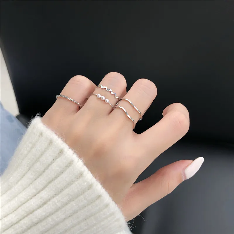 Fleepmart 5pcs/set Rings for Woman Simple Korean Pearl Rings Wavy Metal Twist Ring Trendy Personality Golden Tail Ring Party Jewelry Gift
