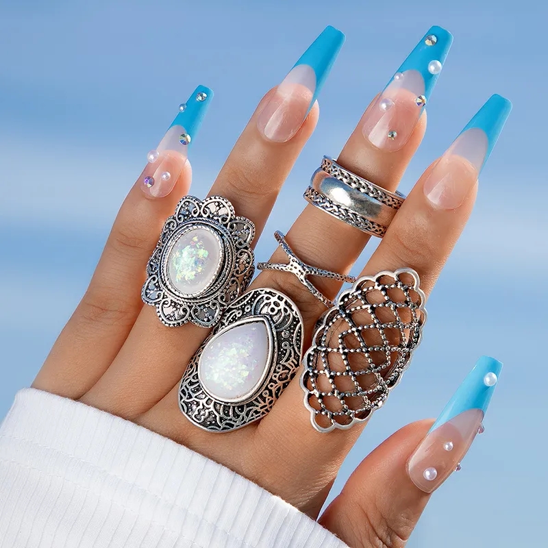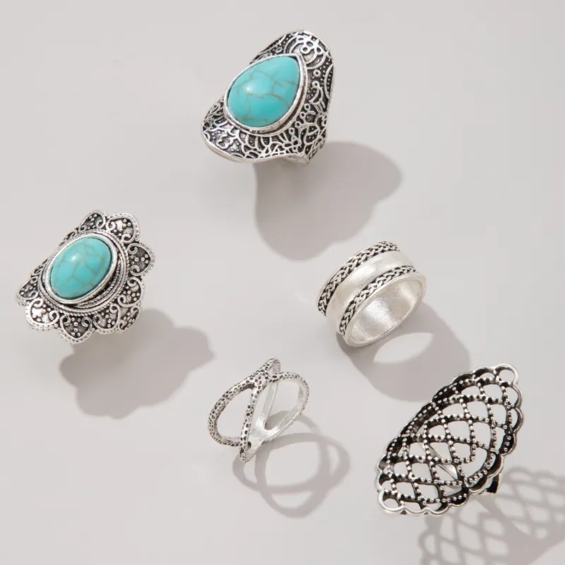 Fleepmart 5pcs/sets Vintage Silver Color Geometric Ring Women Crystal Stone Cross Party Jewelry Accessories