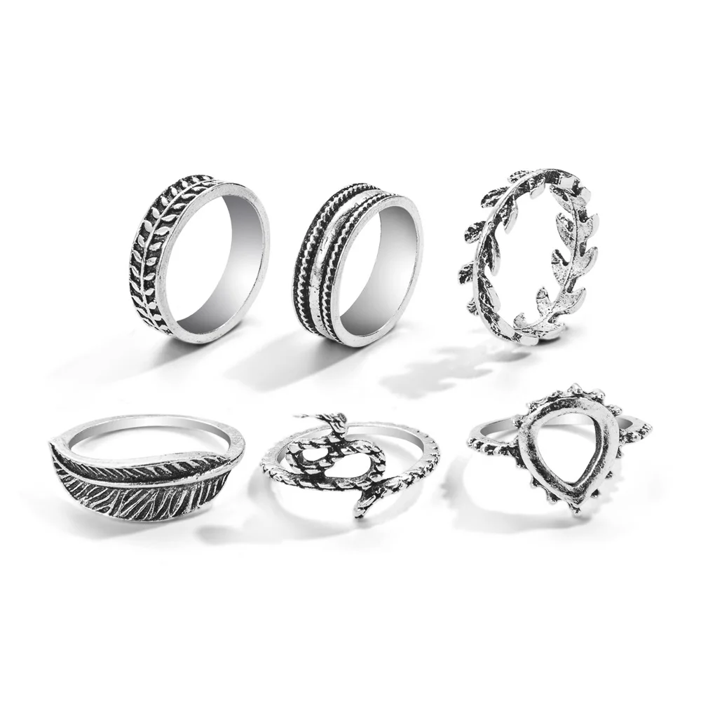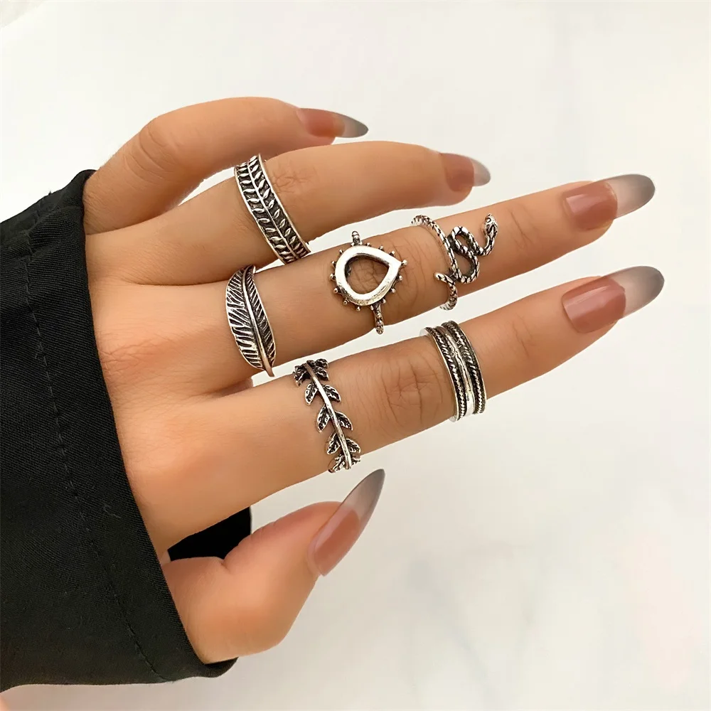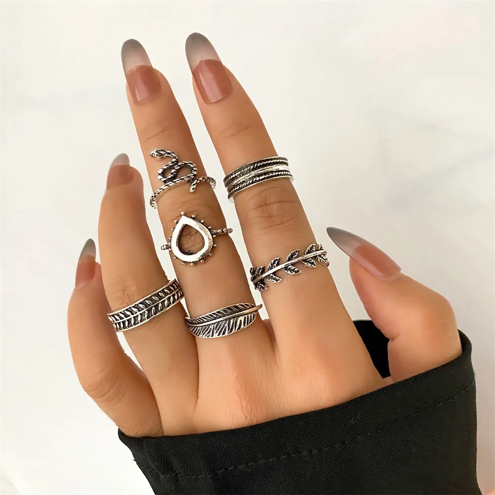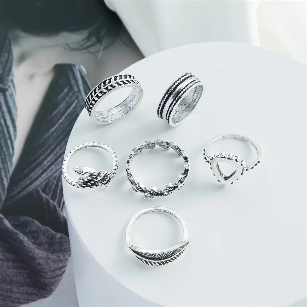 Fleepmart 6Pcs/Set Bohemian Vintage Snake Leaf Knuckle Ring Set for Women’s Punk Geometry Hollow Finger Knuckle Ring Fashion Jewelry Gift