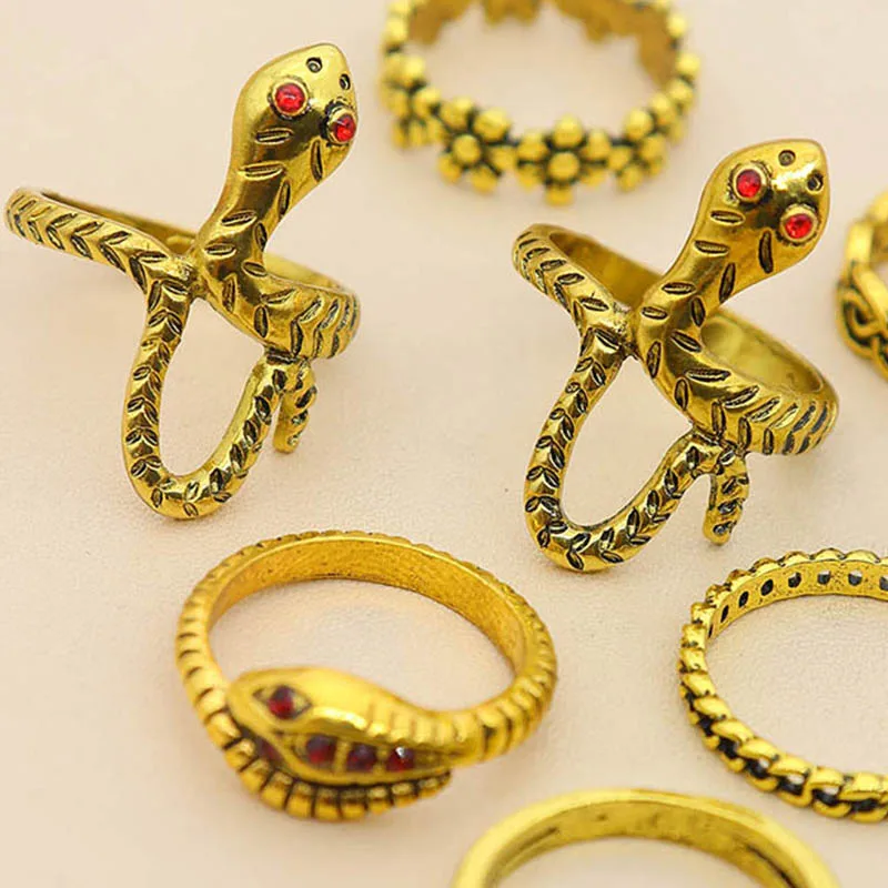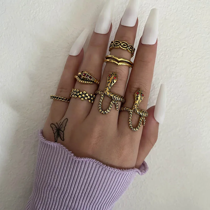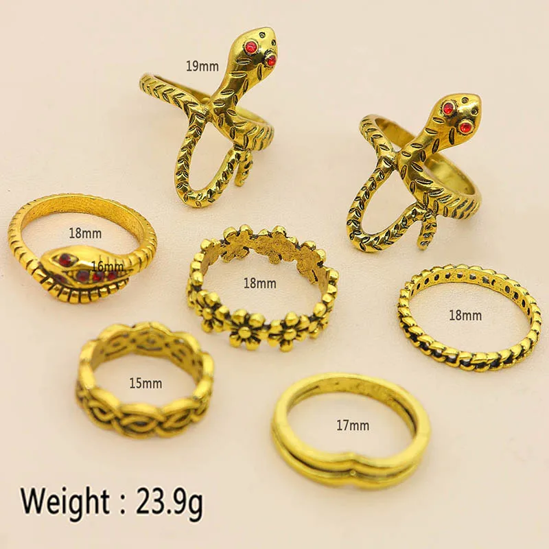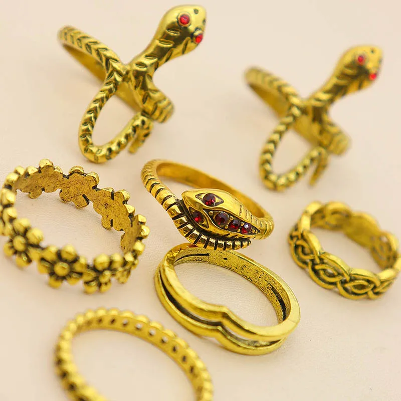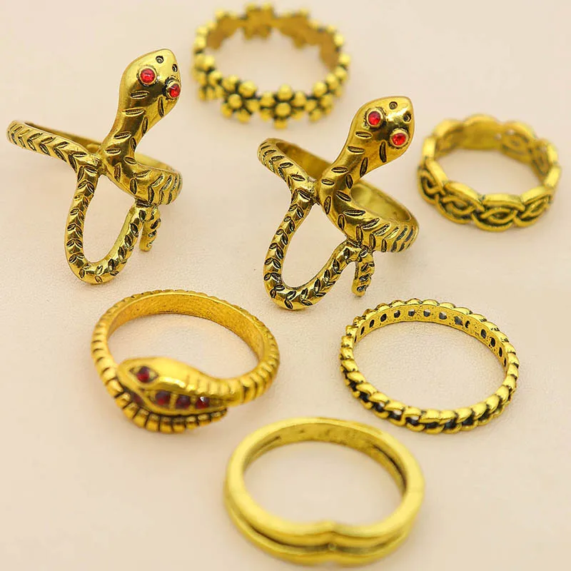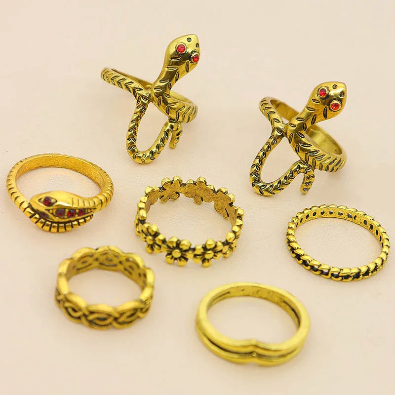 Fleepmart 7 Pcs/Set Women Vintage Rings Gold Color Snake Flower Cross Irregular Gemstone V Shape Finger Ring Set Girl Cute Jewelry