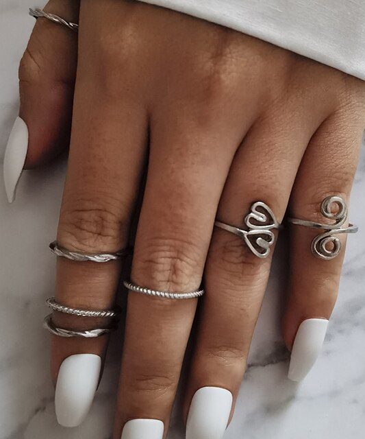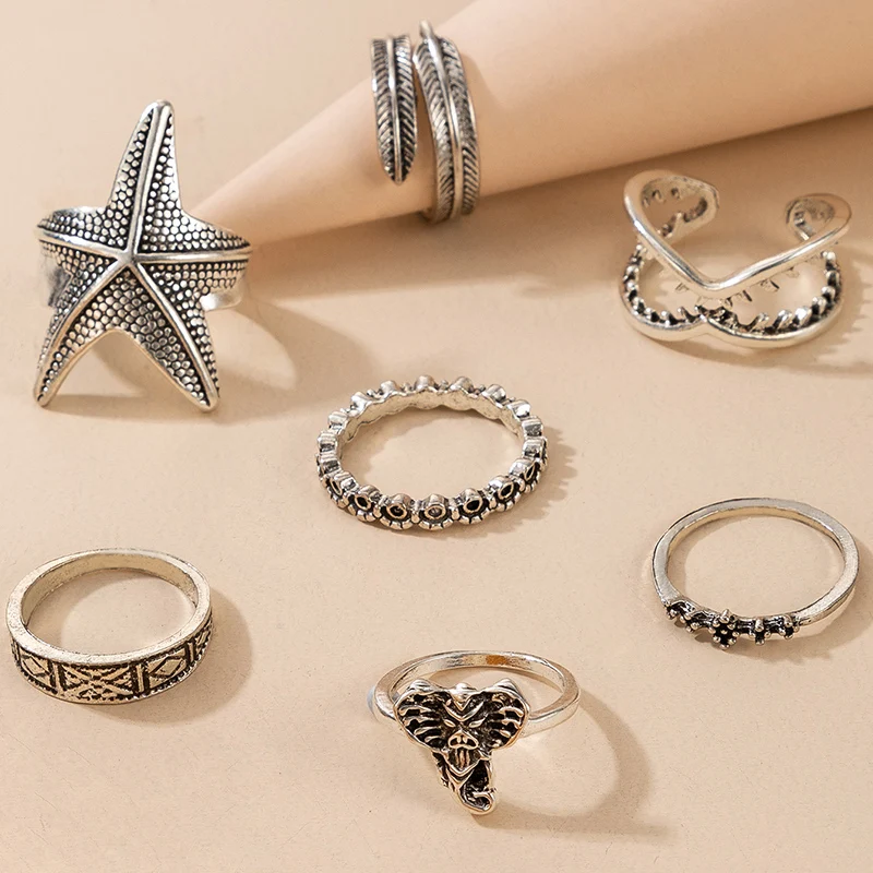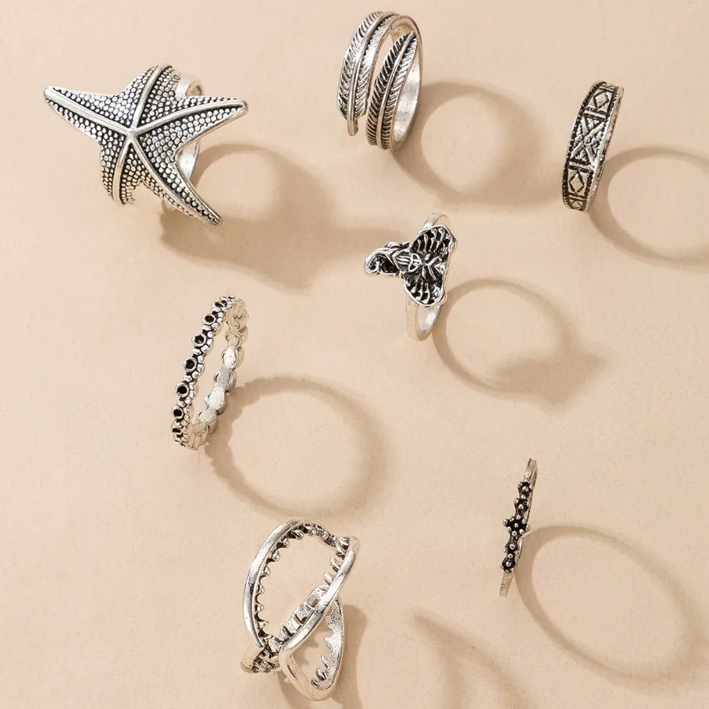 Fleepmart 7pcs/sets Vintage Silver Color Elephant Ring Sets for Women Charms Leaf Summer Starfish Geometric Bohemian Jewelry