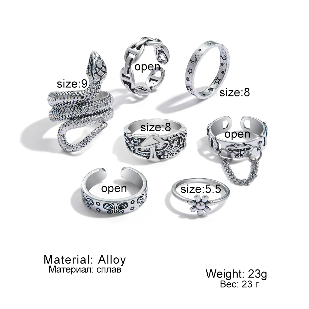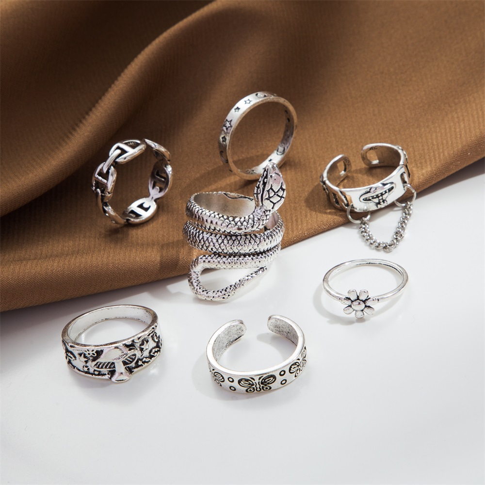 Fleepmart 7Pcs Vintage Metal Snake Butterfly Joint Ring Set For Women Fashion Geometric Pendant Chain Finger Ring Punk Jewelry Wholesale