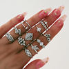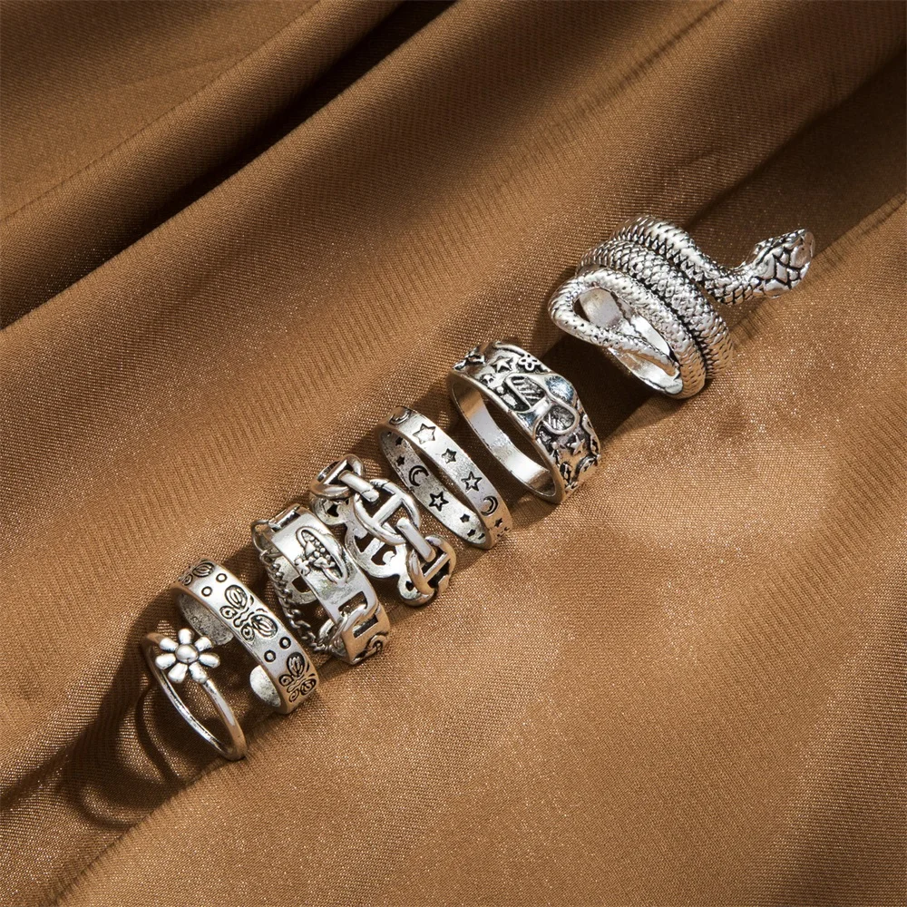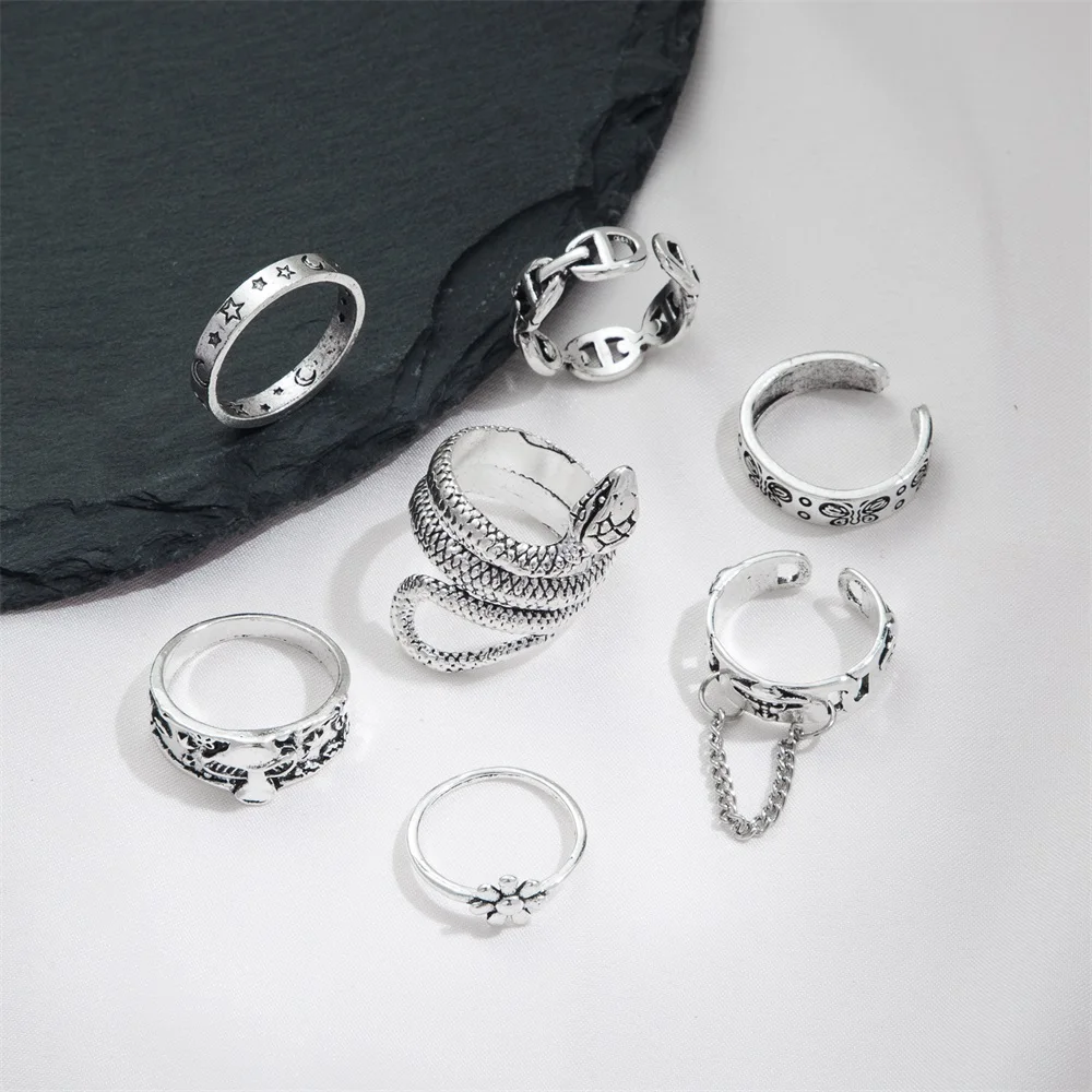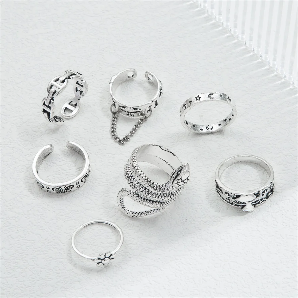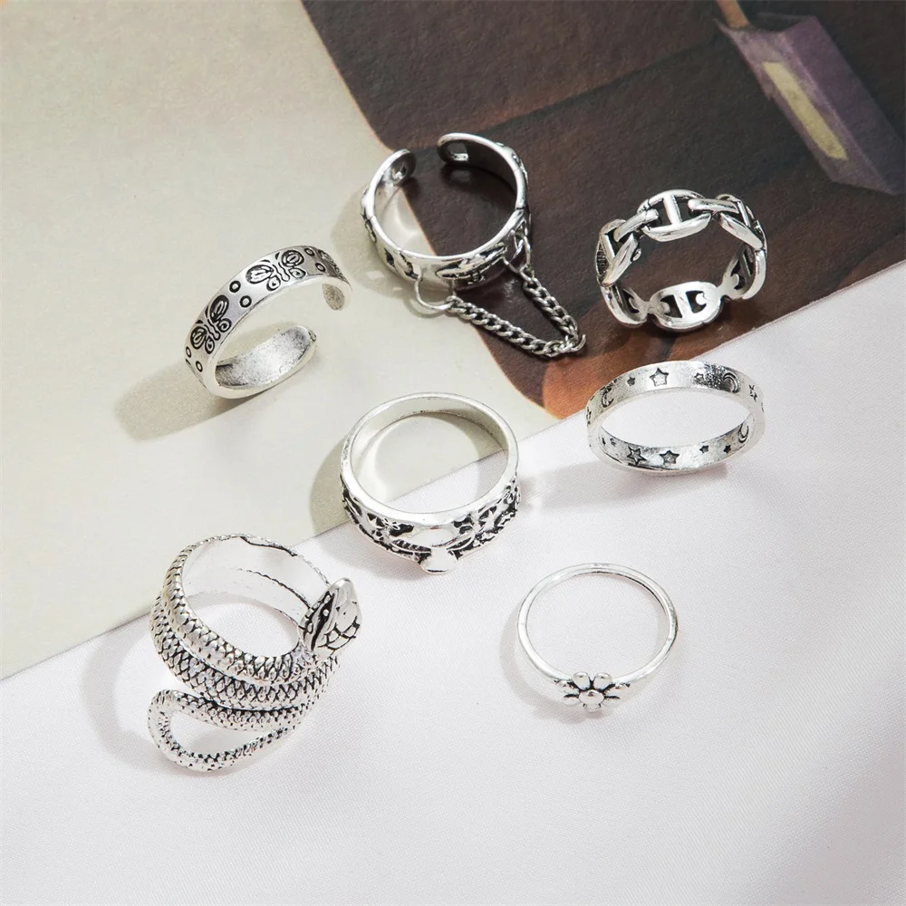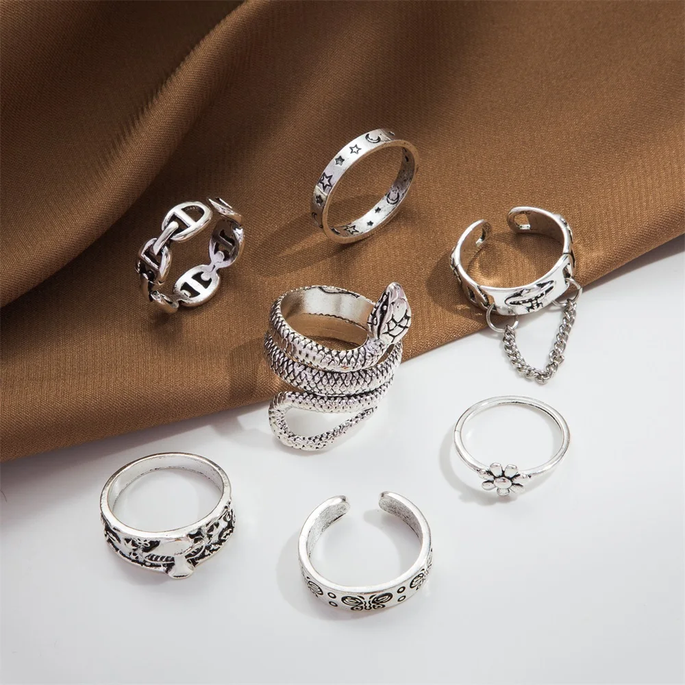 Fleepmart 7Pcs Vintage Metal Snake Butterfly Joint Ring Set For Women Fashion Geometric Pendant Chain Finger Ring Punk Jewelry Wholesale