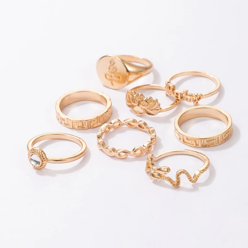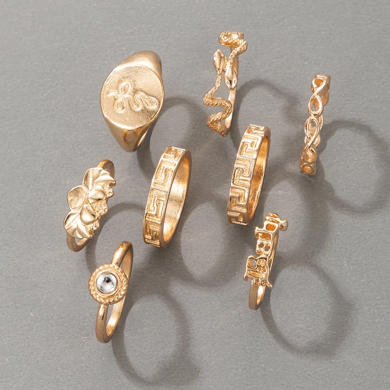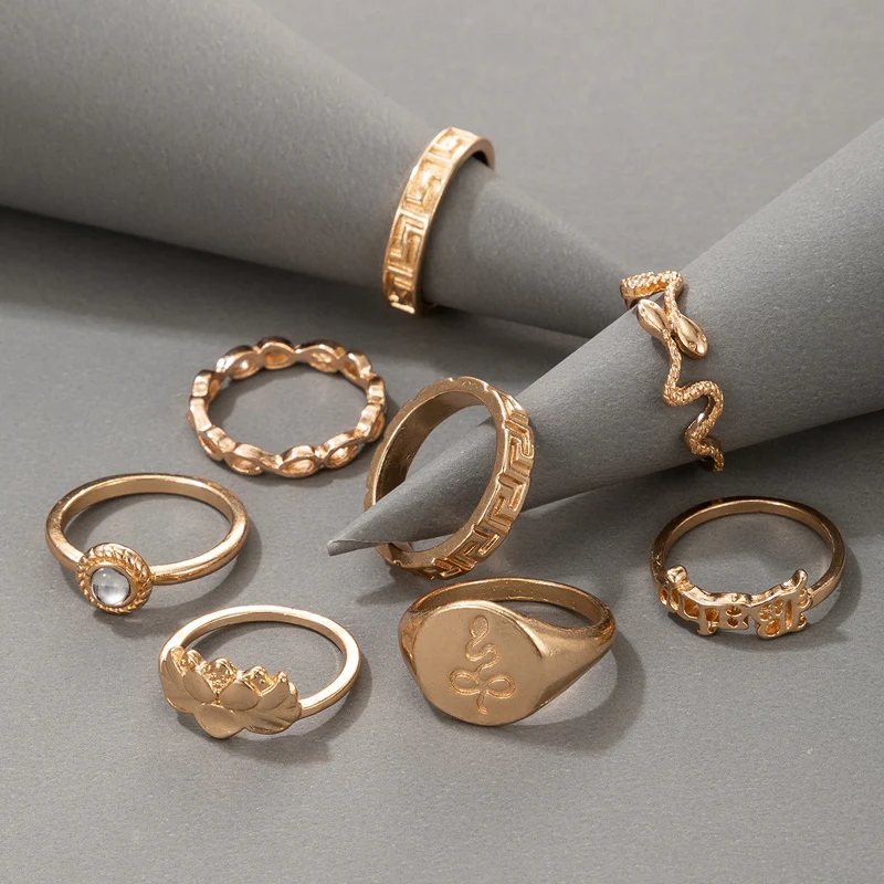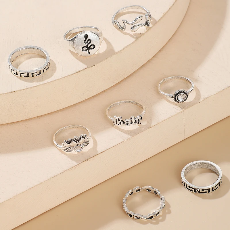 Fleepmart 8pcs/sets Bohemian Silver Color Snakle Lotus Ring Sets for Women Shiny Rhinestone Letter Party Jewelry