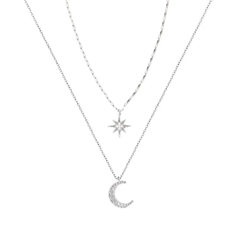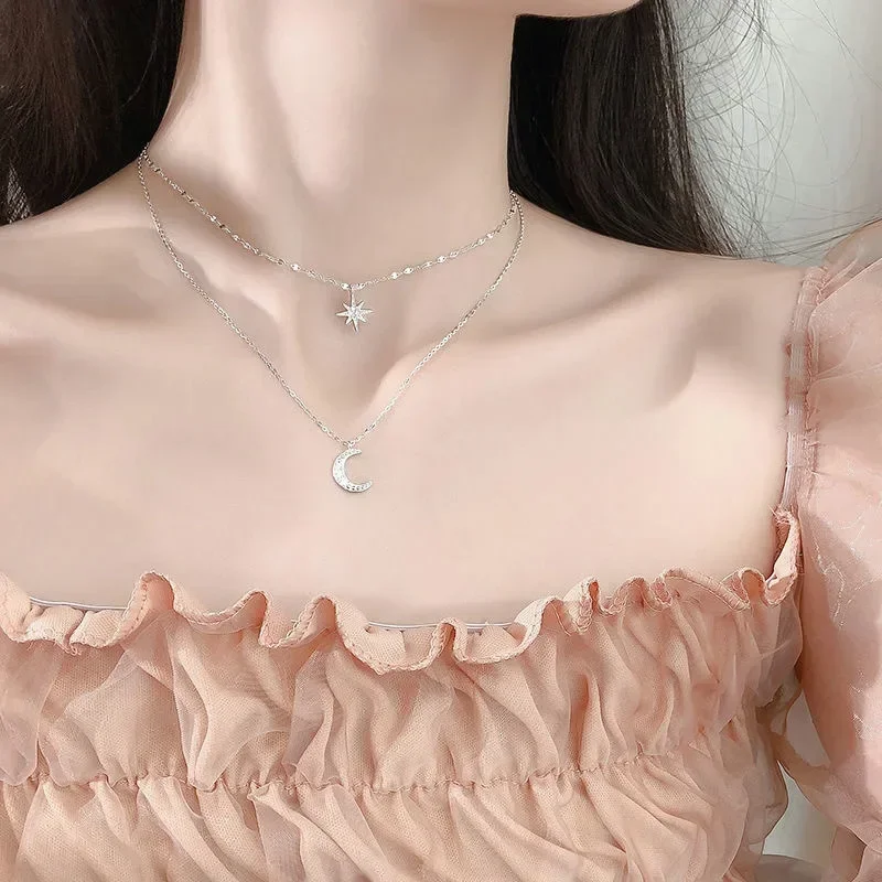 Fleepmart 925 Silver Necklace for Women Double Layer Zircon Star Moon Pendant Necklace Delicate Chain Charm Elegant Fashion Jewelry Gifts